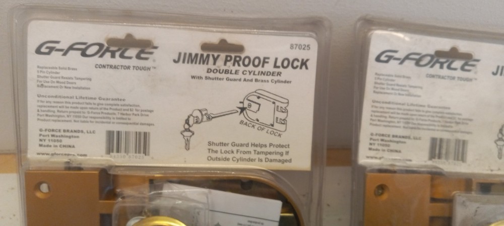 This is a set of 2 G-force Jimmy Proof Locks, specifically designed as double cylinder locks. These locks are from the brand G-force, known for their quality and durability in the market. Ideal for home improvement projects, these door locks provide added security and protection for your home with their double cylinder design. One lock have a corner broken see pictures for details