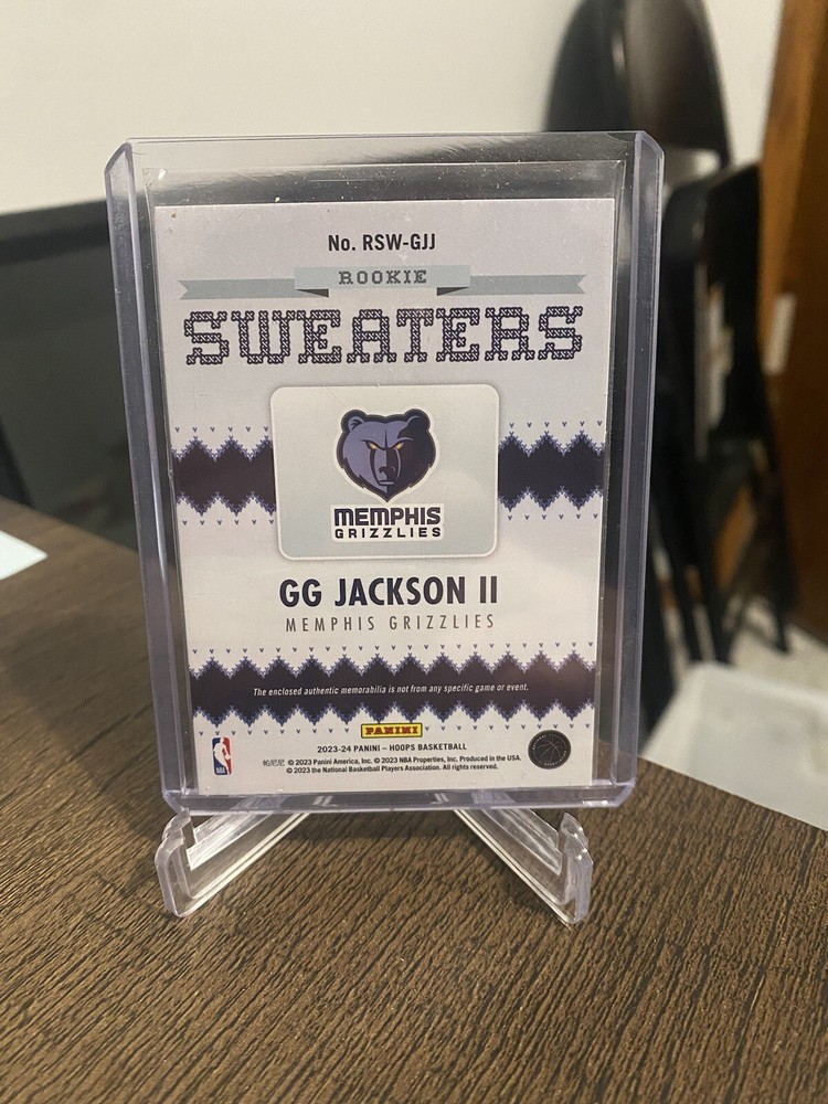 Elevate your basketball card collection with the GG Jackson (RC) Rookie Sweaters Patch card from the 2023-24 Panini NBA Hoops set. This card captures the essence of the Memphis Grizzlies' promising talent, featuring a unique patch and rookie status that's a must-have for fans and collectors alike. With the card number RSW-GJJ, it's part of the sought-after Rookie Sweaters insert set, showcasing a piece of memorabilia that connects you directly to the sport and its emerging stars. Delve into the 2023-24 season with this Panini gem and hold a piece of basketball history in your hands.