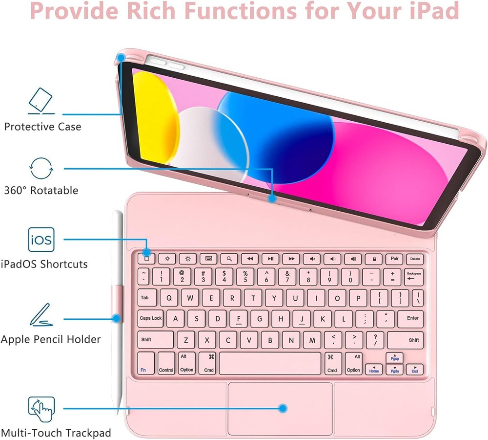 GGH Touchpad Keyboard Case for iPad 10th Generation,Multi-Touch Rose Gold Product Details Package Dimensions: 11.18 x 8.23 x 1.26 inches Item Weight: 2.03 pounds Manufacturer: GGH Language: English Item model number: 10th Gen 2022 10.9-inch Batteries: 1 Lithium Ion batteries required. (included) Brand: GGH Compatible Devices: iPad 10th Generation 2022 Apple 10.9-inch, Model: A2696, A2757, A2777. Connectivity Technology: Bluetooth Keyboard Description: Flexible Recommended Uses For Product: Office, Everyday Use, Personal, Student, Business Special Feature: Auto Wake/Sleep, Portable, Precision Trackpad, 360° Rotation Case, Rechargeable Bluetooth Keyboard Color: Rose Gold Number of Keys: 78 Style: Classic Material: Acrylonitrile Butadiene Styrene 【Precision Trackpad】For iPad 10th generation keyboard with Integrated multi-touch trackpad, edit documents, navigate apps and build presentations with unparalleled precision using a familiar multi-gesture keyboard trackpad 【Multi-Angle iPad 10th Case】The iPad 10th generation case rotates 360°Rotation and 180° Flip,offering multi-angle viewing. You can adjust the screen to any desired angle when you are watching videos, playing games or simply typing.This feature allows you to assume any posture or place your iPad anywhere you like without straining or being affected by reflections. At the same time, the keyboard case with pencil holder,compatible with Apple pencil 【Auto Wake/Sleep & Precise Cutouts】 Auto sleep and wake function protects your iPad battery life.The keyboard is reasonably well-spaced with concave keys and it enables to access all ports and buttons easily. The sturdy, lightweight iPad keyboard case keeps your iPad safe from scuffs and scratches so you can take it anywhere with total peace of mind 【Satisfying After-Sales Service】We provide unlimited customer service support and tech support. Questions will be responded to within 12 working hours. It is a must have for anyone with a ipad 13th Generation