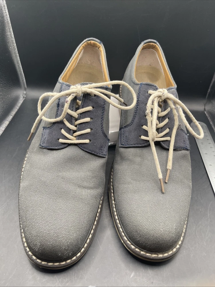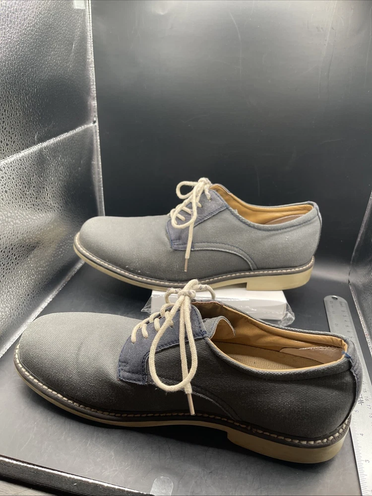 The shoes are medium shade grey with navy blue New shoe laces recommended The material feels like fabric They look dirty in the pictures from the lighting, I assure you they are not Nonsmoking home