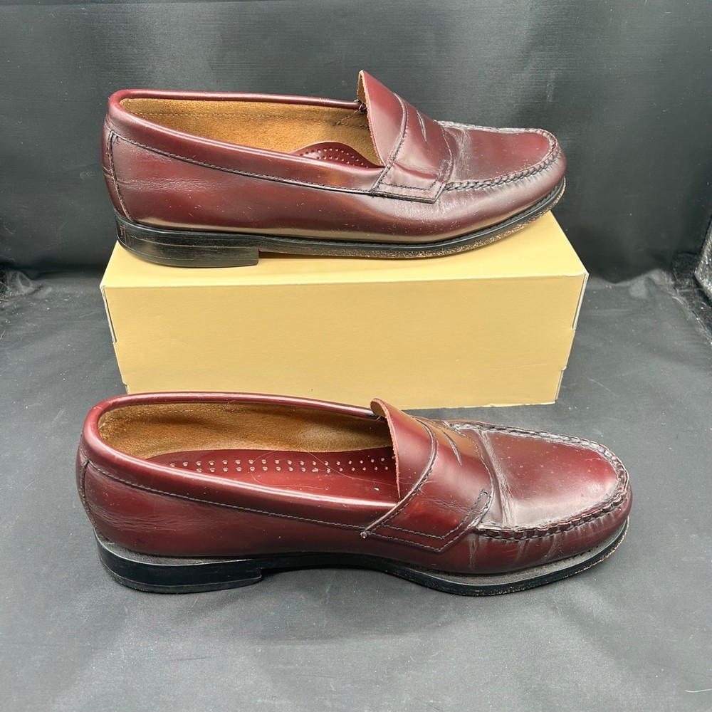 G.H. Bass & Co Weejuns Logan Mens 9 Burgundy Leather Penny Loafers Dress Shoes are in pretty good condition, with wear like creasing and sole rub from age and use. Please see Photos for Condition of Shoes. Color: Red Department: Men Style: Loafer Upper Material: Leather Pattern: Solid Features: Penny Keeper, Leather Lining, Comfort Insole, Slip On Type: Dress Outsole Material: Leather Insole Material: Leather Model: G.H. Bass Logan Keywords: G.H. Bass & Co, Weejuns, Logan, Penny Loafers, Mens Shoes, Burgundy, Leather Loafers, Dress Shoes, Classic Footwear, Business Casual, Comfortable Loafers, Slip On Shoes