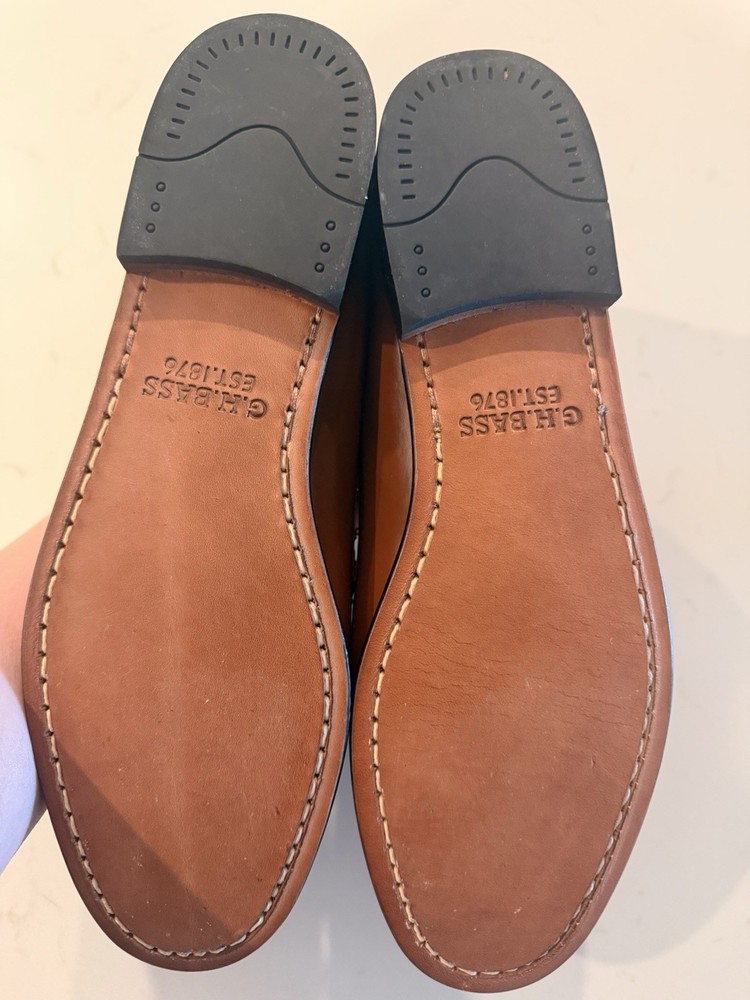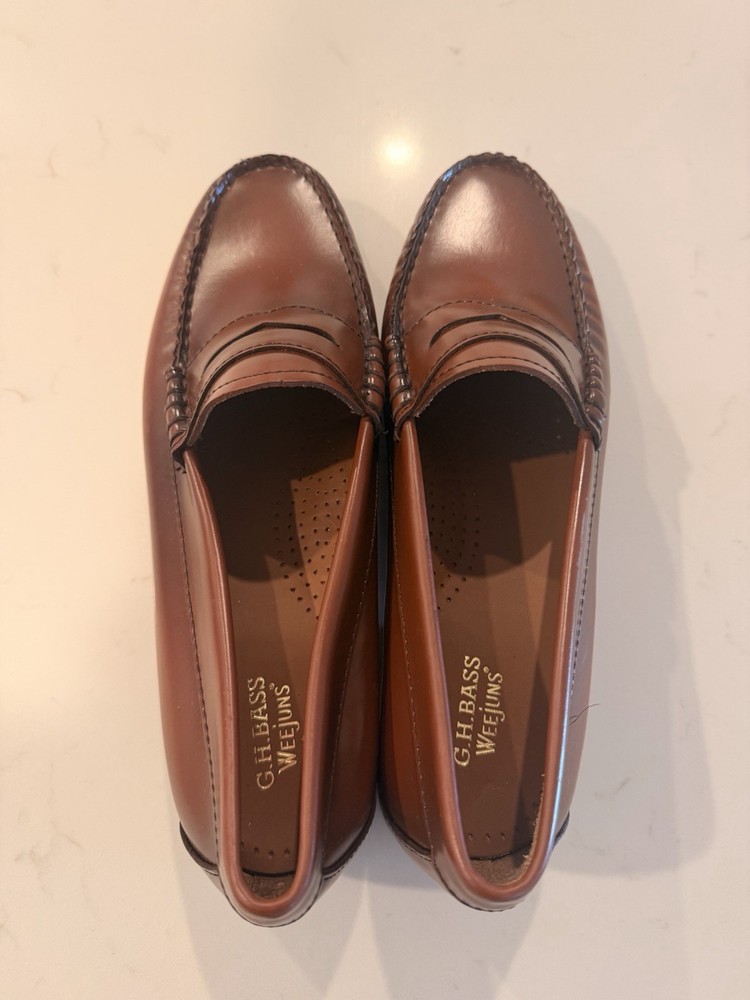 The product is a pair of G.H Bass Whitney Weejuns® Penny Loafers in size 8.5. These brown leather loafers are designed for women and feature a classic penny style with a comfortable flat sole. The G.H. Bass & Co. brand is known for quality and durability, making these shoes both stylish and long-lasting. Perfect for adding a touch of sophistication to any outfit, these loafers are a timeless wardrobe staple for any fashion-conscious woman.