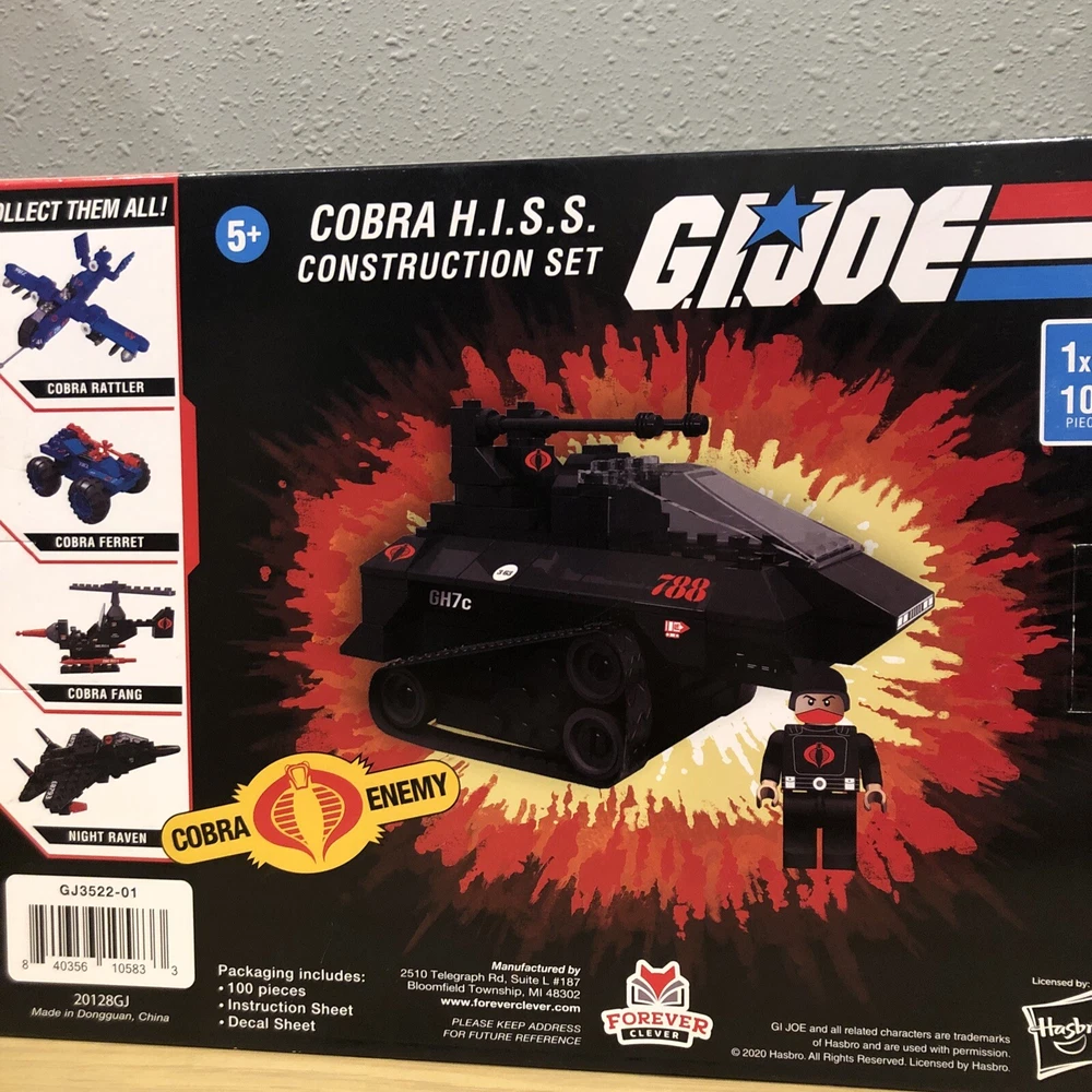 The product is a 2020 GI JOE Cobra HISS Tank with Cobra Enemy construction set. It is an action figure toy based on the Snake Eyes character from the G.I. Joe franchise. The set includes a tank made of plastic, part of the G.I. Joe series by Hasbro. It is an original, unopened packaging from 2021, suitable for ages 3 and up, designed for military and adventure-themed play.