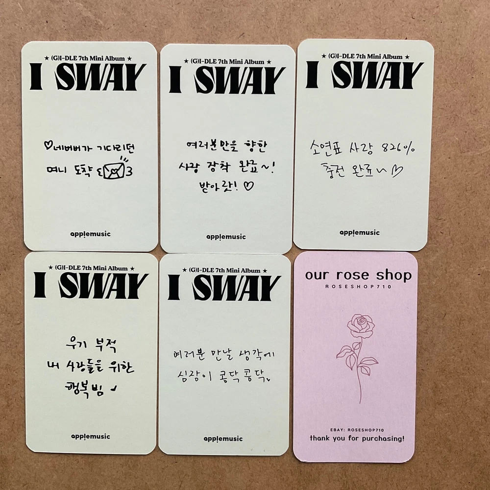 No restocks planned. (Please check profile for information on restocks.) All photocards are authentic, original goods. No returns on photocards. For US buyers : USPS tracked shipping from the US. For international buyers : Please DM before purchase, we can check the shipping fees to ensure correct charge. We are not responsible for any possible customs fees incurred. Description Artist: (G)i-dle Type: Photocard Will be shipped safely in a shipping shield or top-loader. Item condition: There is no noticeable damage , however there may be small scratches or other album damages. Fine scratches, damage, discoloration, slight warping, etc may be possible during packaging and delivery, this is not a reason for exchange. Shipping We will ship in 1-3 business days from receiving payment. Items are on hand and will ship from the USA. All orders will be sent with a tracking number.