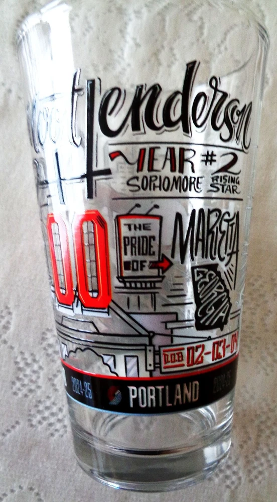 Please IGNORE the glare from my camera flash. This SCOOT HENDERSON Portland Trailblazers glass is hard-to-find as it was a handout at one 2024-25 Blazers game (December 13, 2024). It was only available to the first 7,777 fans attending that game. Attendees were limited to one glass per person. There will be 3 different glasses issued as game handouts (Clingan, Henderson, Sharpe) this season, with Scoot being the second. Glass is
