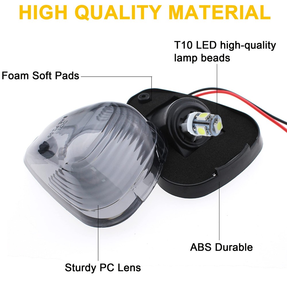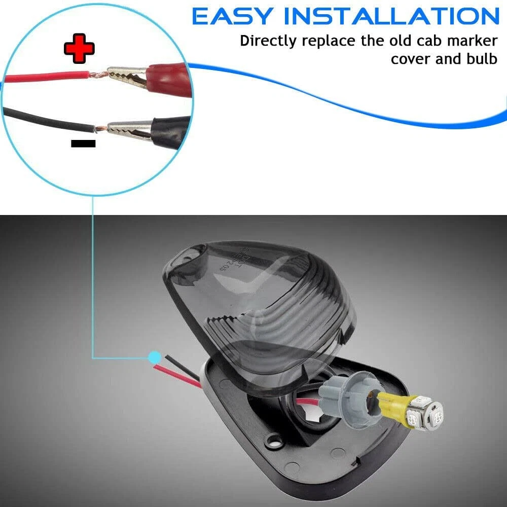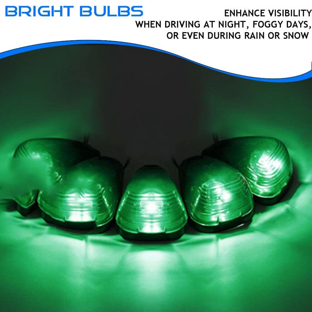 This Cab Roof Running Marker Light Set Complete Kit Compatible with 1999-2017 E150 E250 E350 E450 E550 F150 F250 F350 F450 F550 Super duty pickup truck with stock cab marker lights. Also Compatible with 2017 2018 E350 E450 Super Duty Trucks. (Do NOT fit 2017 2018 F250 - F550); Application: Cab Marker, Cab Marker Clearance Light, Roof Running Light, Roof clearance lights. Interchange Part Number: 8C34-15442-CB 8C34-15442-AD; 264143AM Lens Material: High quality: Every cab marker Lights kit features very strong ABS plastic lens and will not be fade from long time exposure to sunlight and weather elements; soft pads included, fit for fast feet or curved roofs Bulb size: 4 x 3" x 2"; Base size: 3.95" x 2.8" (LxW); Hole to hole distance: 1.7". Pack Includes: 5x Smoked Roof Cab Marker Lights with 5 bases (Assembly Kits) + 5x Green T10 194 168 LED Bulbs