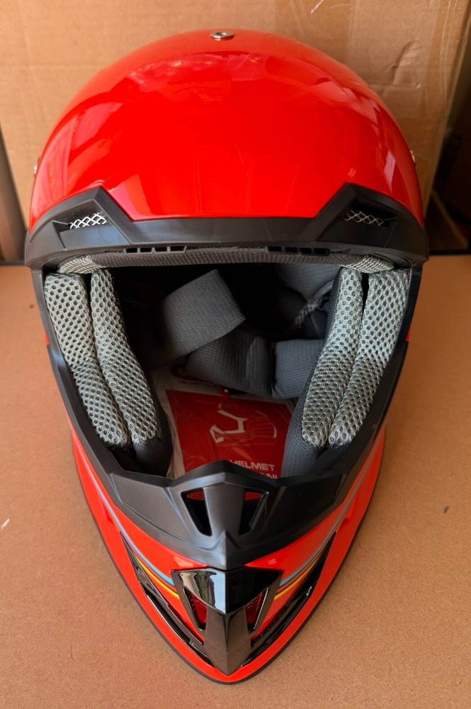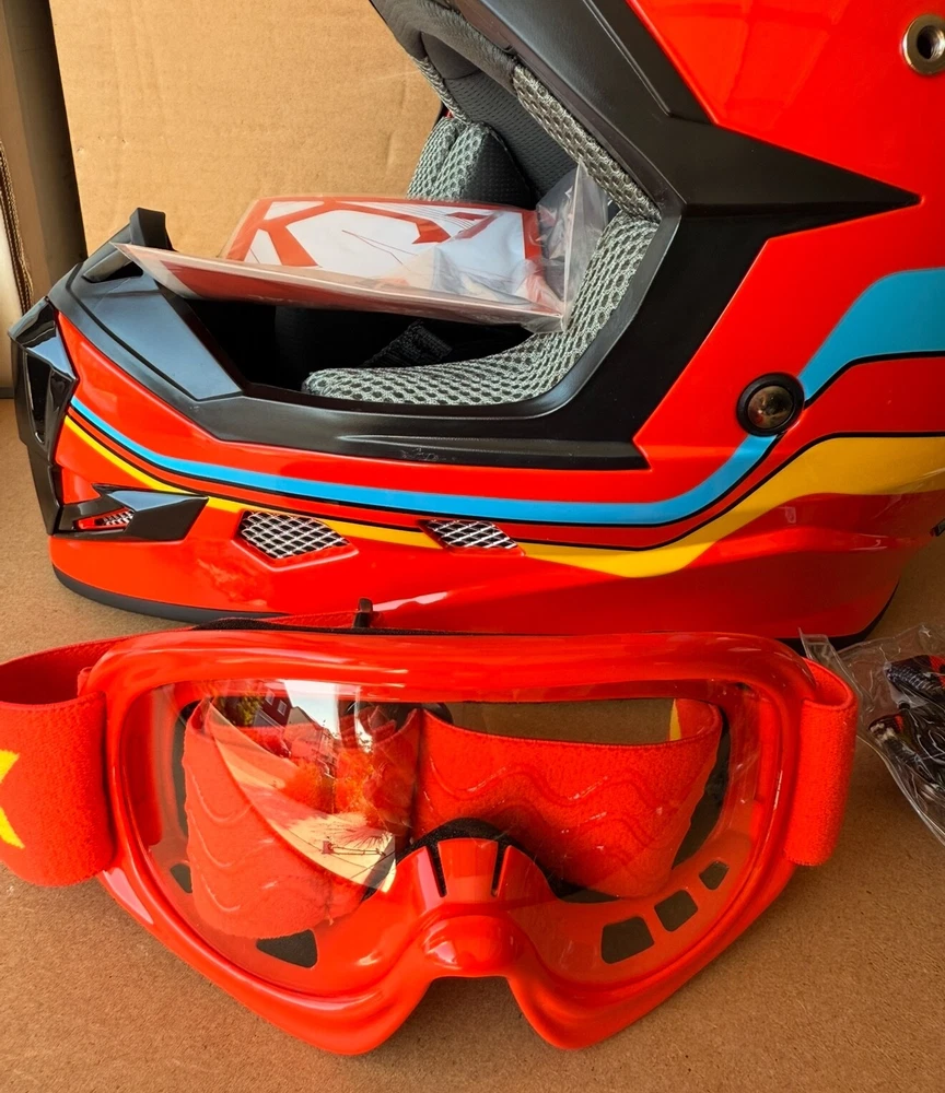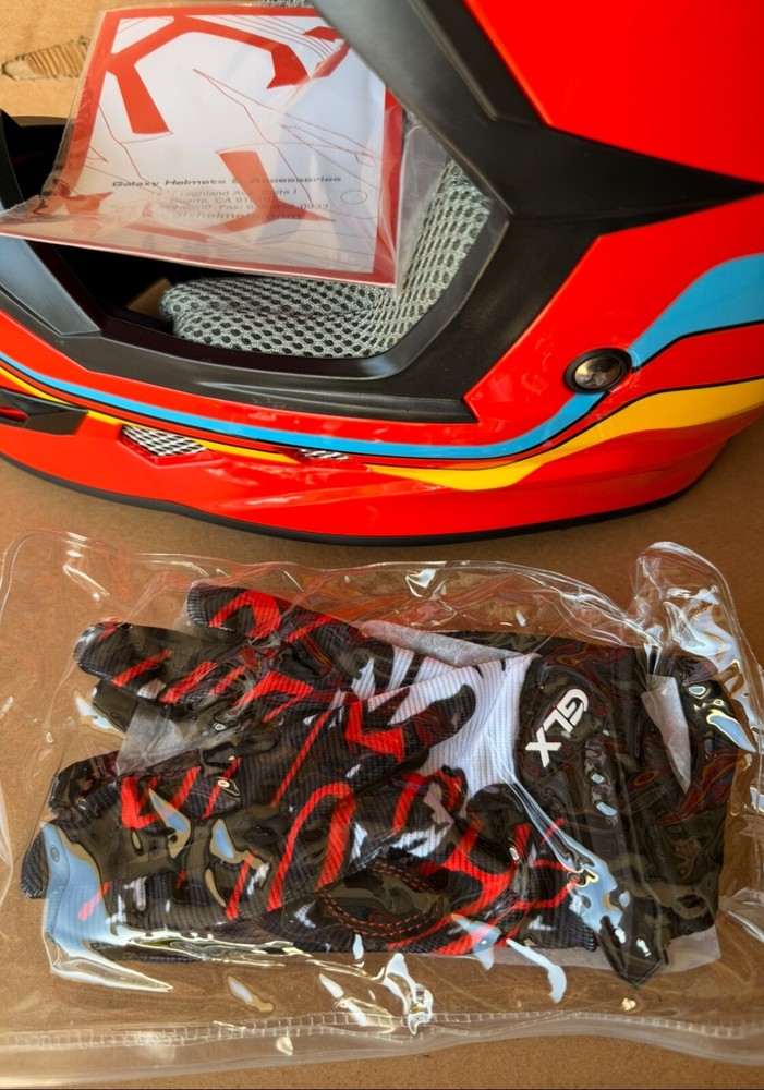Brand new GLX GX623 youth helmet combo in retro red – Size: Large – DOT certified for safety – Designed for ATV, dirt bike, off-road riding – Includes helmet, gloves, and goggles – Lightweight aerodynamic shell – Padded interior for comfort and protection – Quick-release strap for easy use Retail price: $99.95 Pickup in Roseville