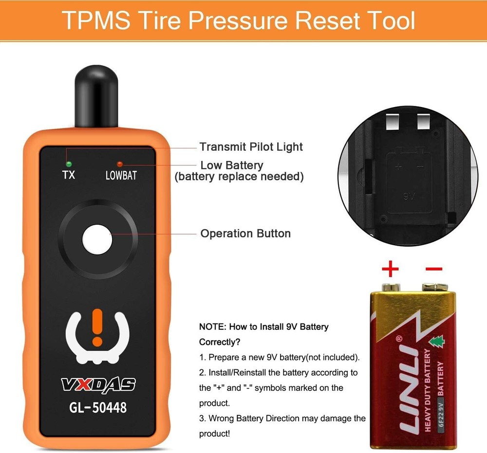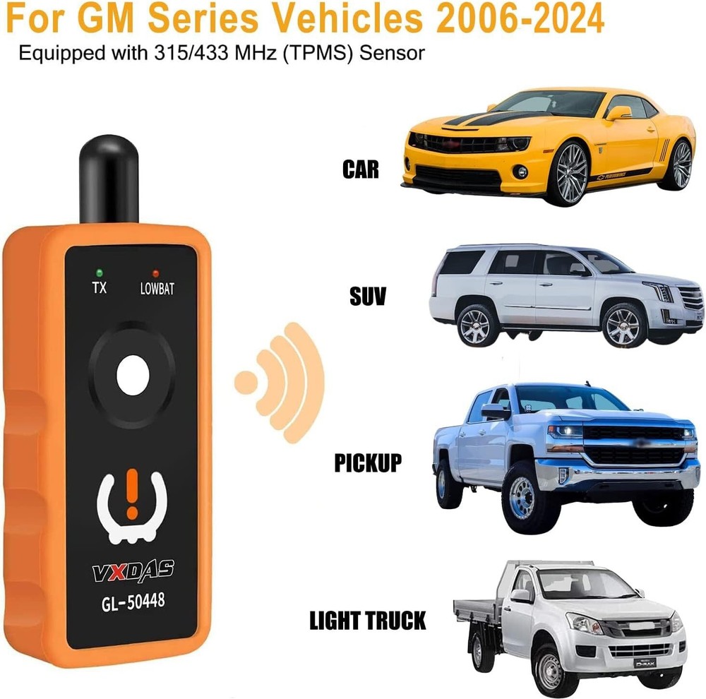 TPMS Relearn Tool for GM Tire Pressure Monitor System Sensor Programming Training Activation Tool OEC-T5 GL-50448 Auto Reset Tool for GM Series Vehicles 2006-2024 About this item : 【2024 UPGRADED GL-50448】 This 2024 Upgraded TPMS Relearn Tool is Equipped with a round antenna and Switch button, offer a Faster & Stronger Signal than other TPMS Relearn Tool. Easy to operate with one hand. 【WIDELY VEHICLE SUITABLE】GL-50448 fits for GM (Chevy/Buick/GMC/Opel/Cadillac) which is equipped with 315 or 433 MHz Tire Pressure Monitor system (TPMS) sensor for 2006-2024. 【ESSENTIAL VEHICLE TOOL】Tire Reset Activate Easily within 1-2 Mins, after tire rotations or change a new tire, Remote Control Door Lock Receiver Module replacement or Tire Pressure Sensor replacement. 【EASY TPMS RESET】TPMS activation tool is easy to activate the individual TPMS sensor with the press of one button. Ensure the vehicle is in TPMS Learn Model, follow the User Manual, Hold tool against the sidewall of the tire, near the valve stem. Depress press button while holding the tool against the tire sidewall. 【FRIENDLY NOTES】1. 9V Battery should be in good condition. 2.Install/Reinstall the battery according to the "+" and "-" symbols marked on the product.3. Make sure the TPMS relearn tool is in correct position while using it. 4. GL-50448 has 12 months warranty. If any problem, just feel free to contact us for soon customer service.