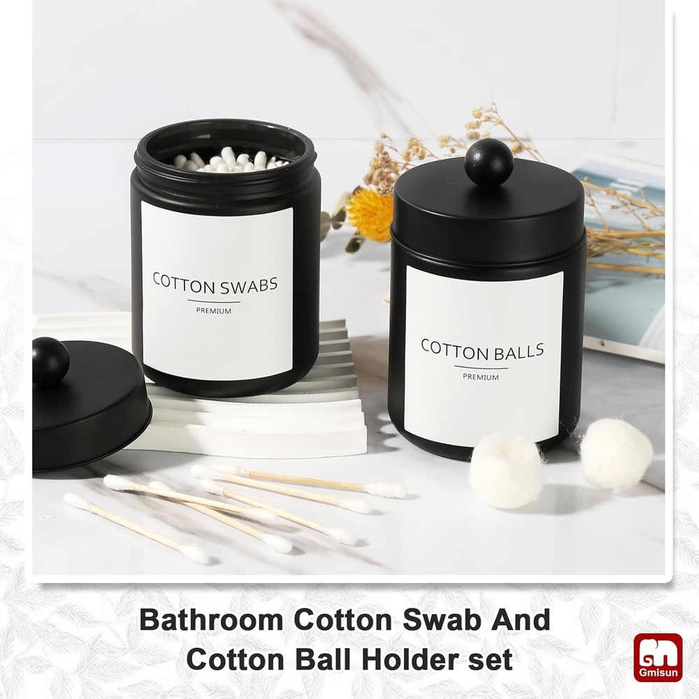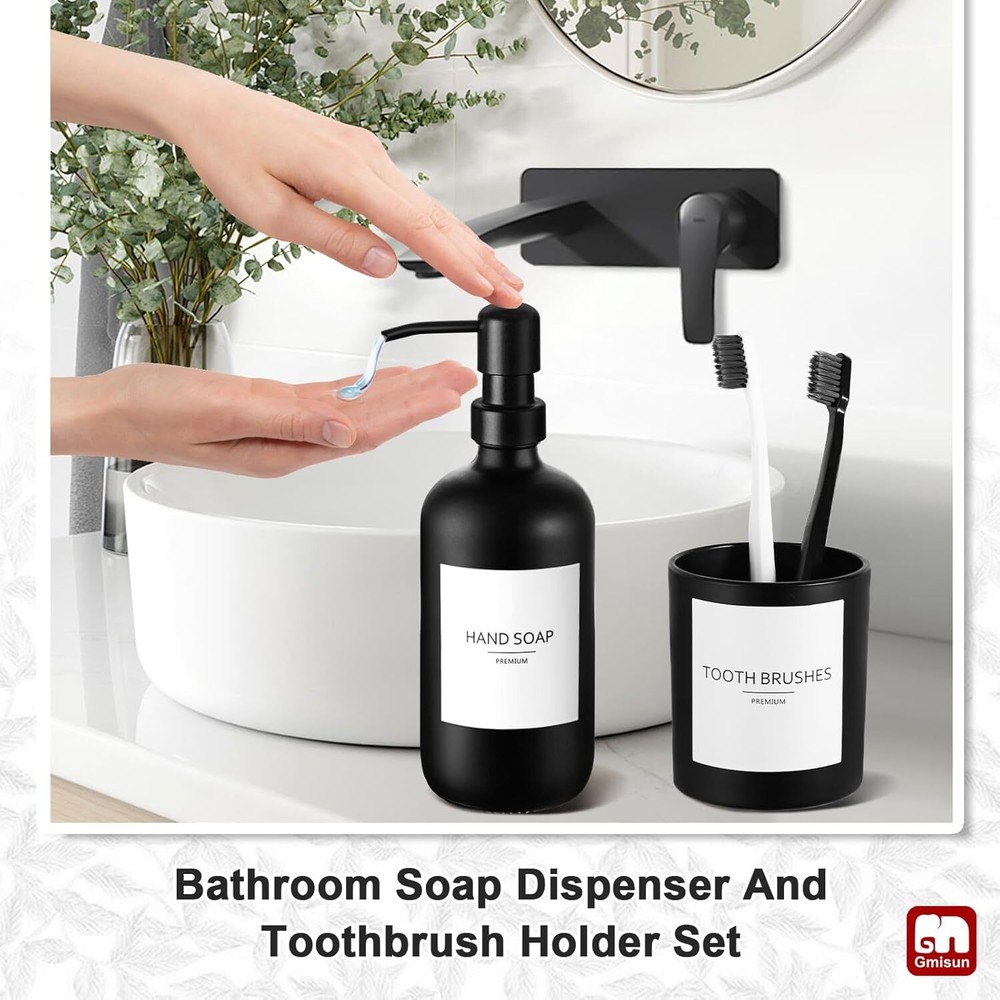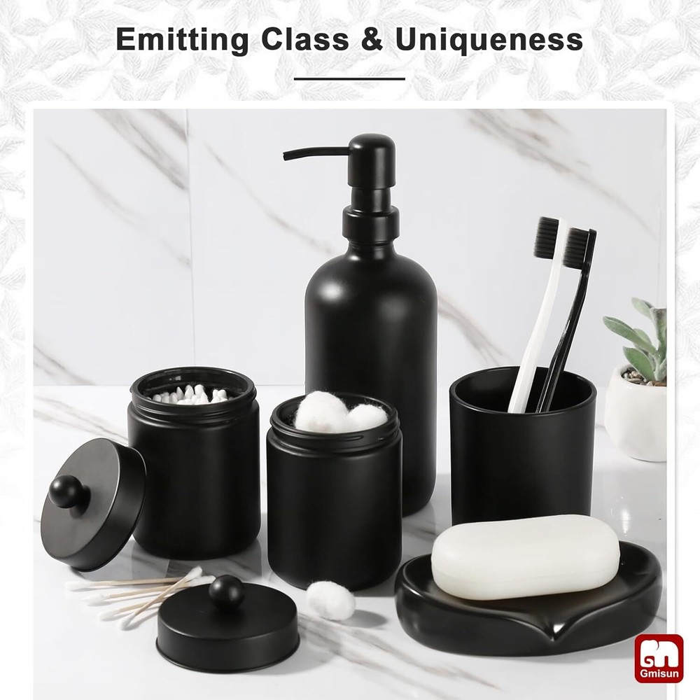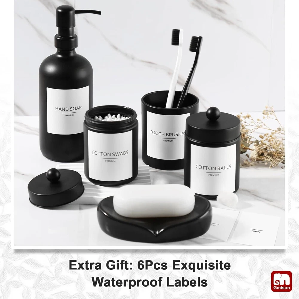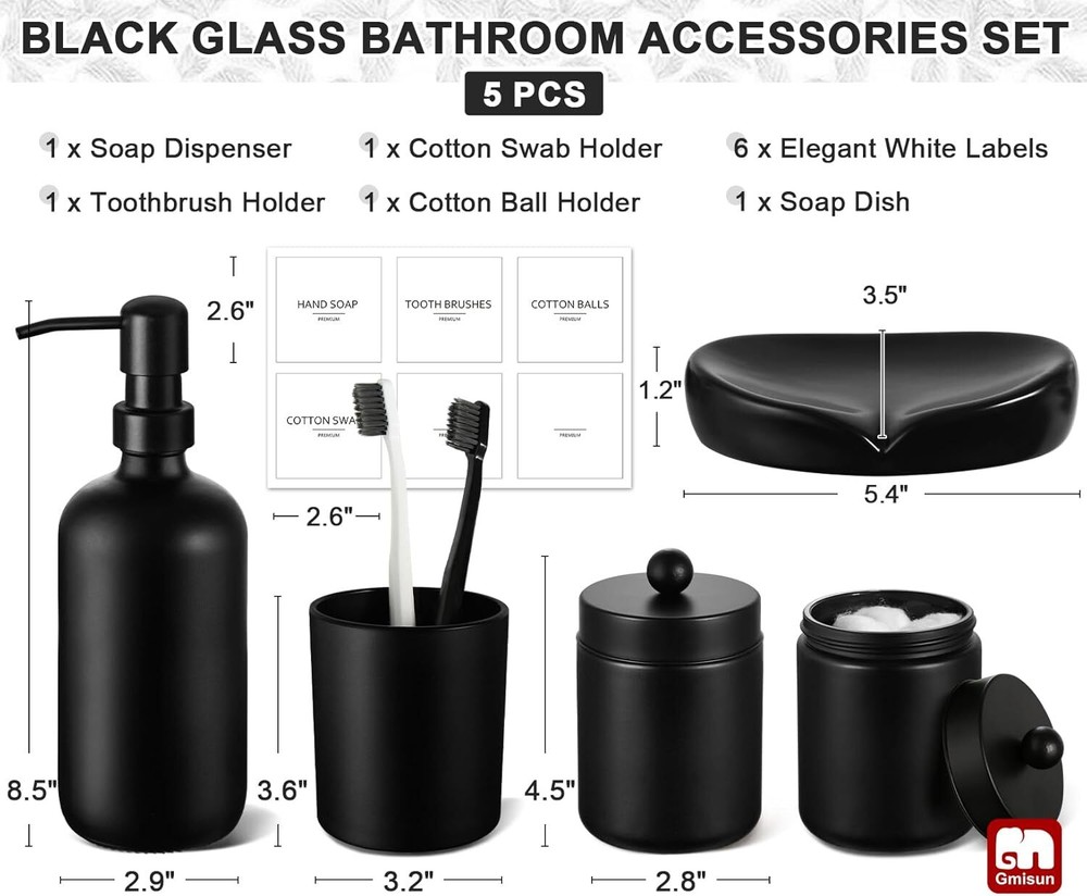 Glass 【ATTRACTIVE 5 PACK BATHROOM ACCESSORIES SET COMPLETE】 Get these elegant additions to your bathroom right now! Let these matte black glass bathroom accessory set brighten your bathroom nicely! These bathroom accessories sets are perfect for every bathroom theme no matter boho, modern, farmhouse, vintage, and western, you name it! You would get a SOAP DISPENSER, a TOOTHBRUSH HOLDER, a COTTON SWAB HOLDER, a COTTON BALL HOLDER, a SOAP DISH, and 6pcs Labels in just ONE set! 【EXQUISITE BLACK CLASS MATERIAL】All these black glass bathroom accessories sets complete are made of high-quality no lead glass. Elegant, sturdy, and heavy-weighted. Not easy to be broken or tip over. Let those plastic or resin inferior bathroom accessories decor leave your bathroom, and let this bathroom soap dispenser and toothbrush holder set complement your bathroom vanity decor. 【EXQUISITE BLACK CLASS MATERIAL】All these black glass bathroom accessories sets complete are made of high-quality no lead glass. Elegant, sturdy, and heavy-weighted. Not easy to be broken or tip over. Let those plastic or resin inferior bathroom accessories decor leave your bathroom, and let this bathroom soap dispenser and toothbrush holder set complement your bathroom vanity decor. 【PRACTICAL FOR USE】If you are a person who loves enjoying your life, you would find that this bath accessories sets for bathroom meets all your daily needs in your life. 16oz Soap dispenser filled with hand soap/lotion/face wash could be used for a long time. Toothbrush holder could hold multiple toothbrushes, toothpaste, combs, and shavers. Two jars could be used for qtips, cotton balls, cotton swabs. Soap dish could help you place your soap better. Makes your bathroom look tidy and wonderful. 【WONDERFUL GIFT IDEA & SUPERIOR QUALITY SERVICE】This bathroom soap dispenser and toothbrush holder set is a great and unique gift for housewarming, wedding, birthday, Mother's Day, Thanksgiving Day for mom, sister, colleague, and friends. We provide 100% product quality guarantee, the fastest, and the best service to ensure your satisfaction. Please let us know if you have any questions.