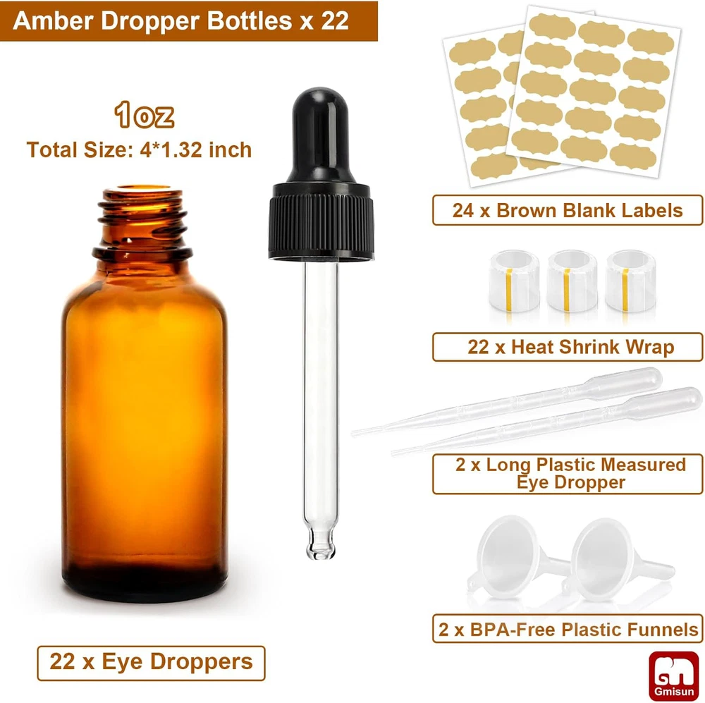 GMISUN Tincture Bottles with Dropper, 22 Pack 1 Oz Amber Glass Dropper Bottle 【Extra Gift: 22Pcs Clear Heat Shrink Wrap】Through simply heating the shrink wrap, the 1oz glass dropper bottle can get better sealing performance and stability. 100% leak-proof and avoid the looseness of the dropper bottle cap caused by accidental friction in your bag or packaging box. And makes it look more professional. Perfect for making homemade essential oils for traveling, selling custom essential oils to your customers, and making DIY essential oils gifts to family and friends. 【Extra Gift: 24Pcs Brown Blank Labels】 In this tincture bottles with dropper set, you would get 24pcs brown blank labels. On these exquisite labels, you can write down the name and the production date of your DIY homemade essential oil blends and tinctures. Let everyone could use it at the right time, and make your homemade essential oil look more elegant and more professional. Make your essential oil storage rack and table clear and tidy. 【Exquisite 22 Pack 1 oz Amber Glass Dropper Bottle Set】 You can get 22Pcs Eye Dropper Bottle with Dropper, 2Pcs Long Plastic Dropper, 22Pcs Heat Shrink Wrap, 24Pcs Brown Blank Stickers, and 2Pcs No BPA Plastic Funnels in one set. Fired at a high temperature of 1200℃, the 1 oz glass dropper bottles has better sealing performance. Its amber glass could protect liquids from UV light. Perfect for making DIY oil essential mixes and tinctures blends. 【Upgraded Dropper】 Each dropper is engineered to hold and release your cherished oils without the dread of drips or spills, ensuring that every drop you intend to use is delivered accurately and cleanly. No more fuss, no more mess—just the perfect amount of your chosen essence, smoothly and securely dispensed. 【No Risk Purchase & Superior Quality Service】 GMISUN aims to provide the best service to every customer and make every customer have the best shopping experience. If you have any questions about these 30ml dropper bottles, please let us know. We will reply to you ASAP and offer you satisfactory solutions. SIMPLE LIFE, DIFFERENT LIFE.