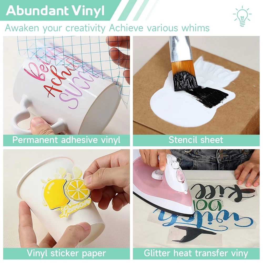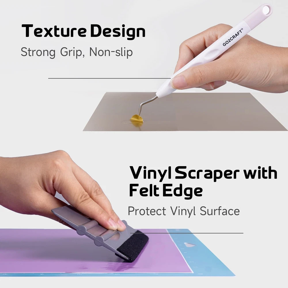 Ultimate Accessories Bundle for Cricut Maker: GO2CRAFT all-in-one craft kit that can meet all your craft needs, Great combining imagination and life. The abundant kit includes 20pcs permanent adhesive vinyl, 8pcs glitter heat transfer vinyl, 12pcs vinyl sticker paper, 10pcs stencil sheet, 4pcs transfer tape, 7pcs perfect vinyl weeding tool set, vinyl scraper with felt edge, 2pcs cutting mat, 24pcs color pen, 2pcs pen adapter, instruction manual. Perfect for beginners. Easy-to-cut Adhesive Vinyl Bundle: Made of high-quality material, The vinyl sheet has a strong stickiness and can adhere tightly to smooth surfaces while being easy to cut, weed and transfer, washable and fade resistant. You can use cutting machine to customize personalized patterns or interesting templates. Transfer tape with grid design, convenient positioning, and transfer without residue. Perfect Weeding Tools: GO2CRAFT Weeding tool is ergonomically designed for a better grip, effortless and non-slip. In addition to essential weeding tools, we add a flat tweezer and a vinyl scraper with felt edge. It doesn't hurt the surface of the lettering film when removing and gripping the cutting film from the cutting pad to create perfect works. In addition, we are equipped with two different viscosity cutting mats, you can choose according to different cutting materials. Meaningful & Amazing Gifts: The perfect tools and accessories help you bring your imagination to reality, decorate your T-shirts, baseball hats, shoes, mugs, handbags, and cards and make your accessories more unique. Also personalize interior signs, wine glasses, coffee mugs, window glass, and decals to create your house. It's perfect for gifting to your friends and loved ones on anniversaries, birthdays, anniversaries, Christmas, etc, and your creations will give it different meanings. Support Your Crafting Journey: GO2CRAFT is committed to providing better materials and simpler and more efficient tools for craft enthusiasts, helping you achieve more possibilities. We attach great importance to the needs and experiences of users. If you encounter any problems during use, please contact us and we'll swiftly provide you with a satisfying solution.