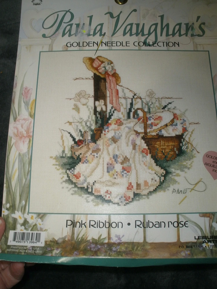 GOLDEN NEEDLE COLLECTION Cross Stitch Kit Pink Ribbon by Paula Vaughan 113964 This kit is new and sealed in package. The finished size is 6 3/8" by 6 5/8" The kit contains 32 linen fabric, instructions, Chart, needle, Certificate of Authenticity, and presorted cotton floss. This kit features a beautiful quilt draped on a picnic basket and a charming straw hat with a Pink Ribbon hanging on a fencepost If you have any questions or problems - before or after. Please message me.