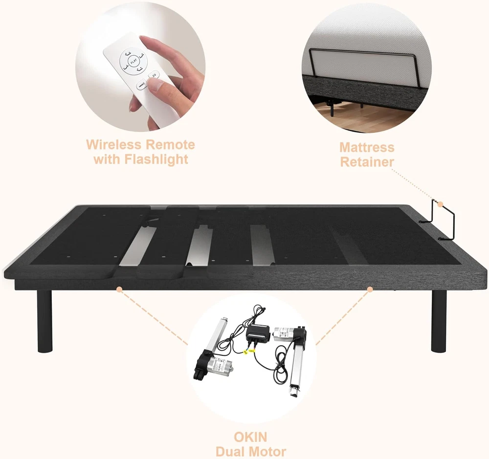 Store New Arrivals Add to Favorite View Feedback Contact GOLDORO Queen Size Adjustable Bed Frame, Electric Bed Base, Wireless Remote Control, Whisper Quiet Durable Motor, Independent Head and Foot Incline, Padded Edge Description Item model number SS006-Q Finish Type Powder Coated Style 12-inch Legs & Padded Edge Furniture Finish Black Assembly Required Yes Color Black Form Factor Queen size adjustable bed frame with 12-inch legs, padded edge, powder-coated finish, and black color Product Dimensions 78.74"L x 59.1"W x 14.76"H Material Engineered Wood, Metal, Plastic, Polyester Compatible With Mattress Size Queen Item Weight 126 pounds Included Components Bed Base, Motor, Slat Size Queen Special Feature Cordless Brand GOLDORO Manufacturer GOLDORO CUSTOMIZABLE COMFORT: Independent head incline from 0 to 60 degrees, foot incline from 0 to 40 degrees. Zero-gravity position to treat yourself with the feeling of weightlessness and release stress after a hard day's work RELIABLE MOTOR: The enhanced motor features a robust aluminum alloy tube, ensuring excellent load capacity and long-term durability. It can lift up to 550 lbs for the head and 350 lbs for the foot. COMPATIBLE WITH VARIOUS MATTRESSES: Complete your optimal bed with the mattress of your choice, this base is compatible with memory foam, gel foam, latex foam, and soft hybrid mattresses BETTER SLEEP QUALITY: Enjoy lifestyle and health benefits with this GOLDORO adjustable bed frame. The bed frame will helps relieve snoring, decrease back pain, reduce swelling, improve heart health and breathing, and alleviate acid reflux Product description ABOUT US We offer the best prices around on high quality products. Our E-store includes media such as books, movies, music and games while offering electronics, toys, sporting apparel, clothing, tools, general home, garden items and more. SHIPPING We are always working hard to ensure your package arrives as soon as possible. Please understand that some factors like weather, high postal traffic, and the performance of shipping companies are outside of our control. RETURNS We offer a 30-Day Return Policy on items which you are not completely satisfied with. You have the option for a full-refund or an exchange of the item. No returns are available on items shipped outside of the USA. PAYMENT We accept PayPal. CONTACT US This page content is yet to come Please ad us to your favorite seller and visit again later Thank You CUSTOMER SATISFACTION We try our very best to make sure every customer is completely satisfied. If there's a problem, message us! We're happy to help. WE ACCEPT Copyright © 2021 AutoDS. | All Rights Reserved