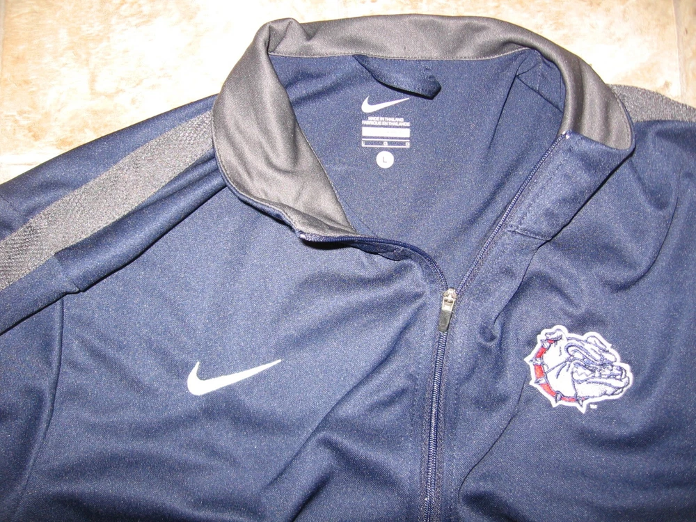 UP FOR AUCTION IS A GU ZIP UP JACKET BY NIKE, SIZE MEN'S LARGE, ARM PIT TO ARM PIT: 22", TOP TO BOTTOM: 29", 100% POLYESTER. THE LEFT CHEST HAS AN EMBROIDERED NIKE LOGO, THE RIGHT CHEST HAS A SEWN ON GU PATCH. THE FRONT OF THE JACKET HAS TWO ZIPPERED POCKETS.