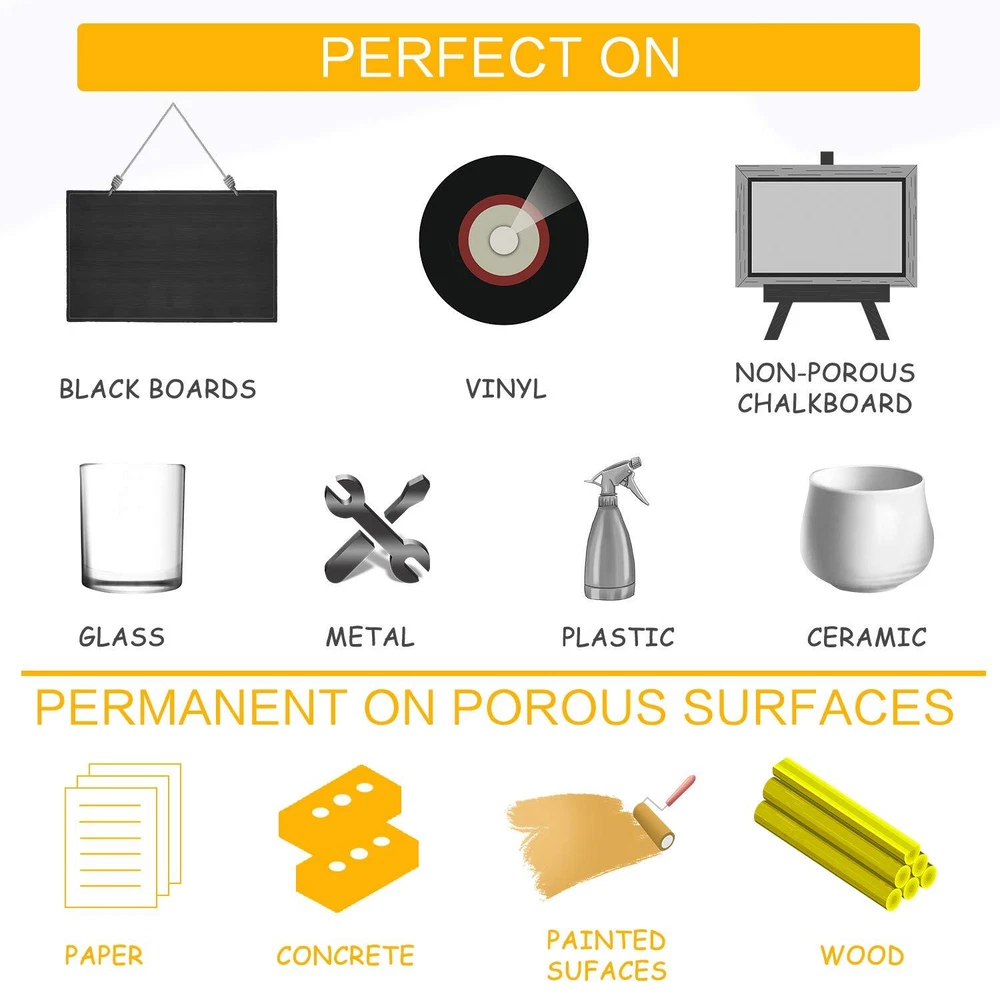 30 VIVID NEON COLORS - GOTIDEAL liquid chalk pens use new upgraded ink that brings more fluorescent colors to our customers . All colors are extremely pigmented, vibrant, and long lasting. Reversible tip makes it easy to do both fine and bold work! Make beautiful artwork to creating holiday decorations for Christmas, 4th of July, Halloween, Birthdays, Graduation Car Decorations and more. Have fun and be creative! EASY TO CLEAN - GOTIDEAL liquid chalk pens will keep your design in perfect condition,non-toxic, water-based liquid chalk markers can be erased easily by wiping the area with a damp cloth or paper towel. EXTRA GIFTS - Our 30 markers pack comes with 4 extraordinary metallic colors and the BONUS of 24 CHALKBOARD LABELS, 3 TIPS for FREE. INCREASE YOUR BUSIINESS: Add character to your establishment with GOTIDEAL LIQUID CHALK MARKER SET! it will give your project a chalk-like effect while being so much more vibrant! Perfect for use on Windows, Mirrors, Plastic,Menu Boards, Chalkboard Labels, Chalkboard Paper, Bistro Boards and more. PLEASE NOTE - Our chalk markers work perfectly with bright and vivid colors on ALL non-porous surfaces. it's recommended to try them first on small areas and always follow the cleaning instructions provided.NOT ALL CHALKBOARDS ARE SUITABLE FOR THE USE OF CHALK MARKERS. PLEASE TRY THE MARKERS ON SMALL AREAS FIRST TO AVOID RUINING YOUR BOARD.