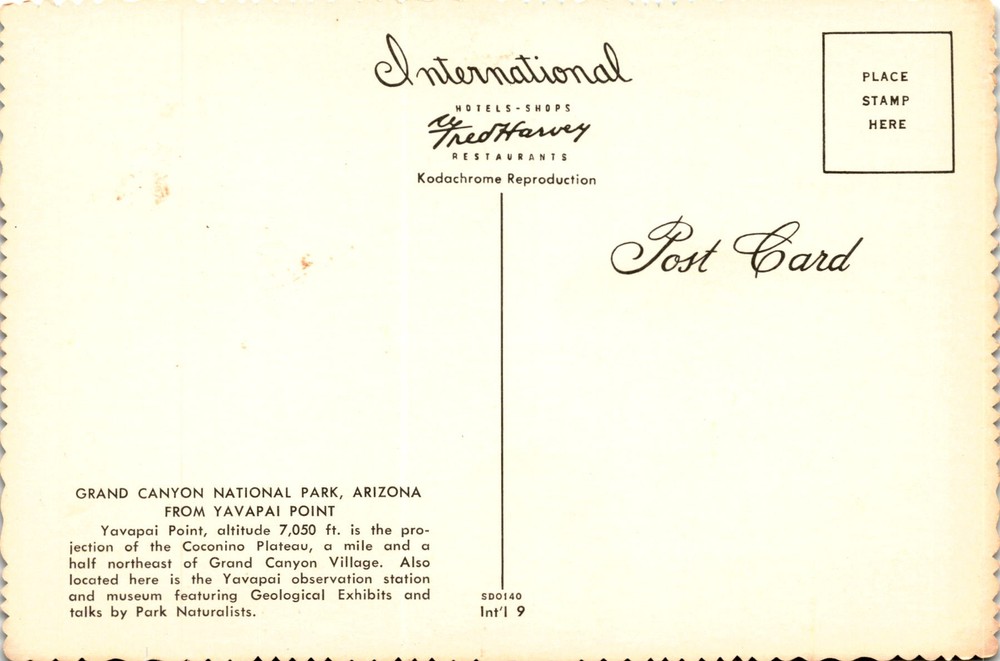 MAKE AN OFFER. THE MORE YOU BUY THE BETTER DEAL I WILL ACCEPT The postcard advertises various services and attractions related to the Grand Canyon National Park in Arizona. It mentions international hotels, shops, Fred Harvey restaurants, and Kodachrome reproduction postcards.