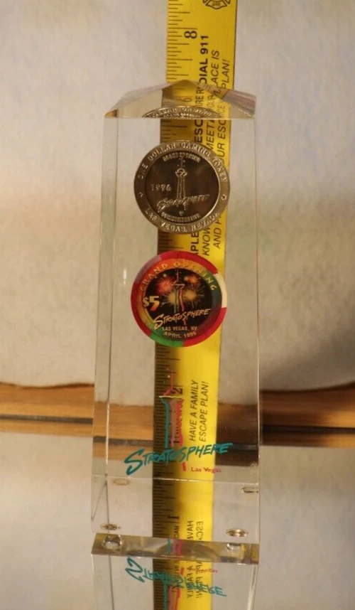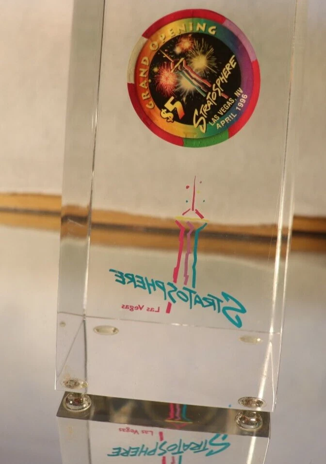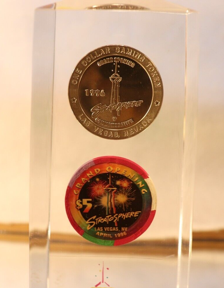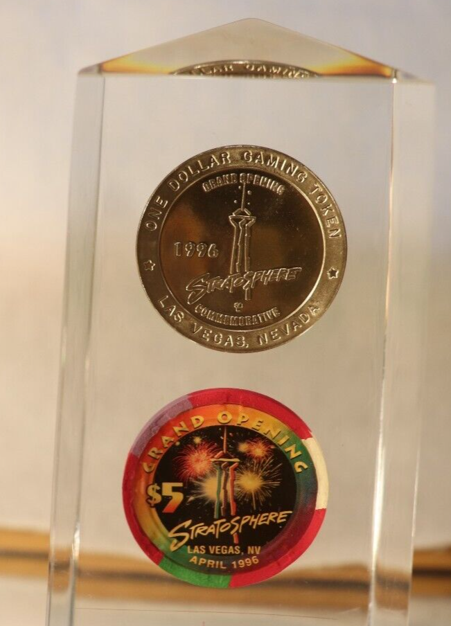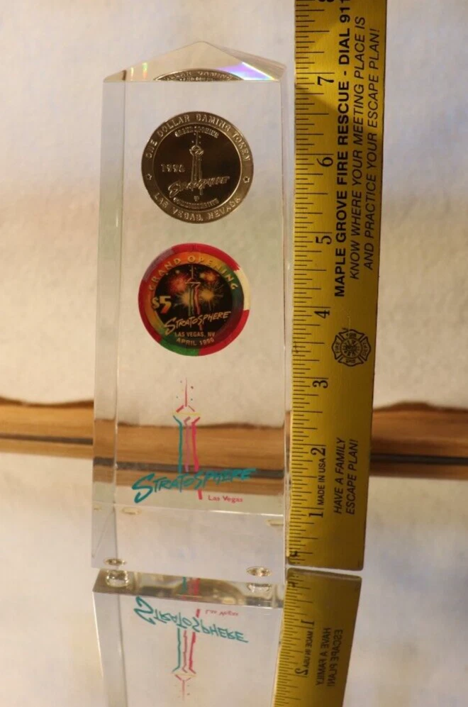 Up for sale is a nicely done Lucite Display, featuring the Grand Opening-(April 1996) of the Stratosphere casino in Las Vegas, show casing their $1 & $5 gaming tokens. (See Pictures #4 & #5) Will be coming to you in Excellent Pre-Owned Condition, Very nicely done display. (See Pictures) The display stands about 7-1/4 inches tall. (See Pictures #14 & #15) There are 15 Close-Up Pictures for you to get a good look at what you are bidding on. E-BAY, FOR IMMEDIATE SHIPMENT. WE SHIP INSURED PRIORITY, FIRST CLASS, AND MEDIA USPS MAIL WITH DELIVERY CONFIRMATION RECEIPT. WE SHIP FIRST CLASS INTERNATIONAL MAIL USPS with NO INSURANCE. WE SHIP PRIORITY MAIL INTERNATIONAL WITH INSURANCE and GLOBAL USPS ONLY! The postage for this item is $9.80 in the continental U.S.A. Other than U.S.A., e-mail for shipping rates. MINNESOTA RESIDENTS ADD 7.525% SALES TAX There is a 30 day return policy for a full refund, excluding Postage. If you are not satisfied with your purchase, please notify by e-mail that you will be returning an item. GOOD LUCK BIDDING!!!!! AS ALWAYS YOUR SATISFACTION IS A MUST!!!!!!!!!!!!!!