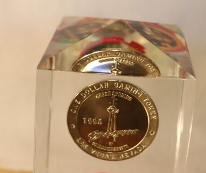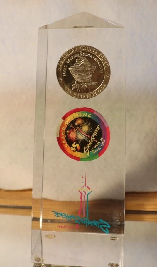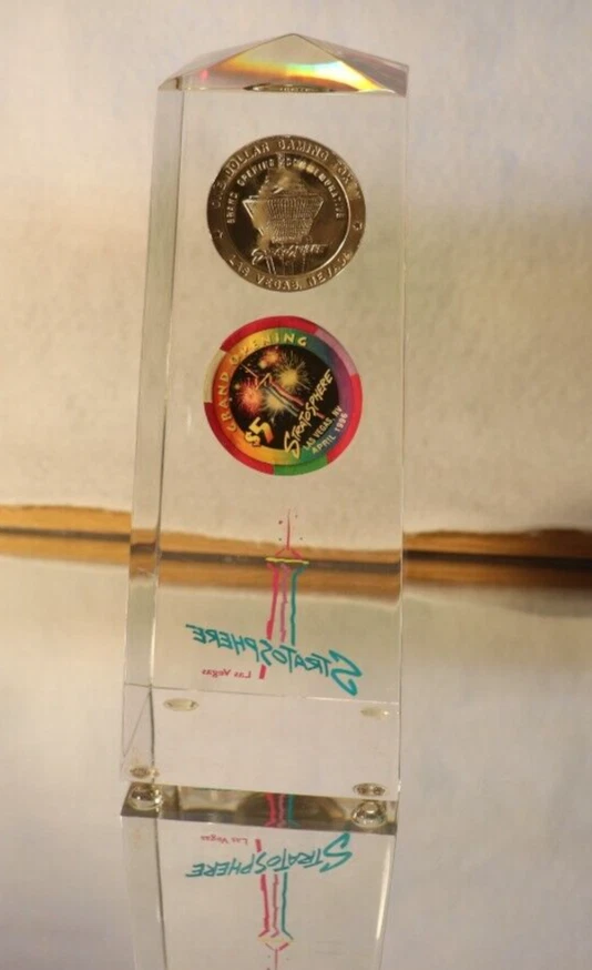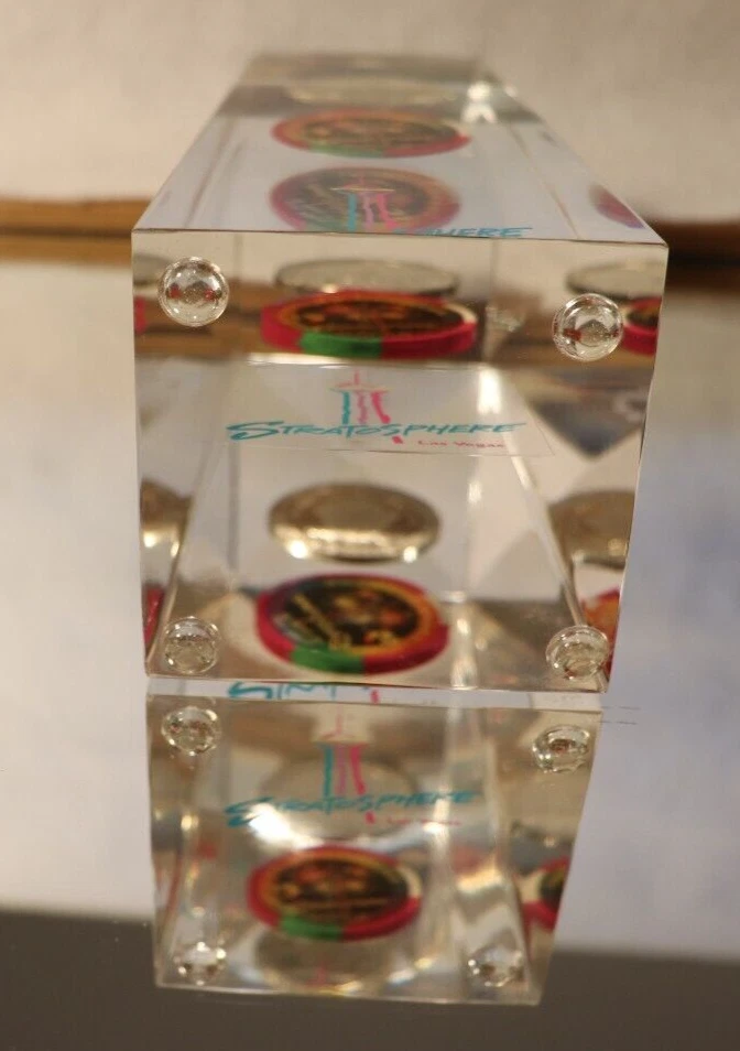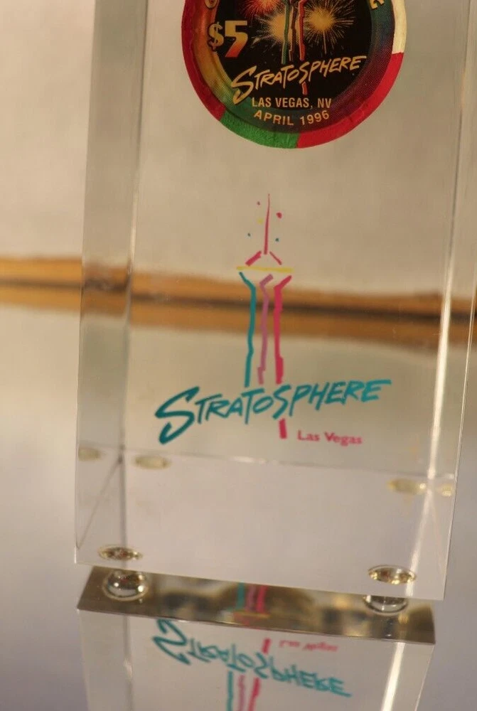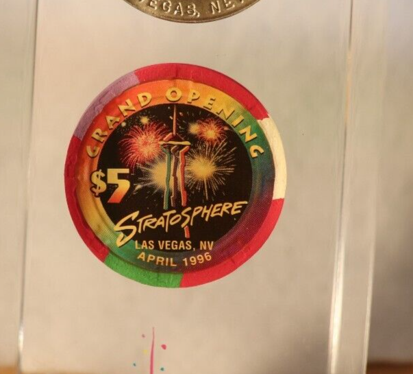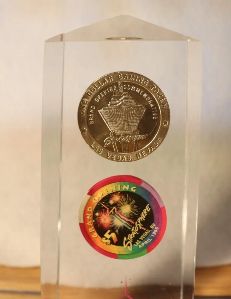 Up for sale is a nicely done Lucite Display, featuring the Grand Opening-(April 1996) of the Stratosphere casino in Las Vegas, show casing their $1 & $5 gaming tokens. (See Pictures #4 & #5) Will be coming to you in Excellent Pre-Owned Condition, Very nicely done display. (See Pictures) The display stands about 7-1/4 inches tall. (See Pictures #14 & #15) There are 15 Close-Up Pictures for you to get a good look at what you are bidding on. E-BAY, FOR IMMEDIATE SHIPMENT. WE SHIP INSURED PRIORITY, FIRST CLASS, AND MEDIA USPS MAIL WITH DELIVERY CONFIRMATION RECEIPT. WE SHIP FIRST CLASS INTERNATIONAL MAIL USPS with NO INSURANCE. WE SHIP PRIORITY MAIL INTERNATIONAL WITH INSURANCE and GLOBAL USPS ONLY! The postage for this item is $9.80 in the continental U.S.A. Other than U.S.A., e-mail for shipping rates. MINNESOTA RESIDENTS ADD 7.525% SALES TAX There is a 30 day return policy for a full refund, excluding Postage. If you are not satisfied with your purchase, please notify by e-mail that you will be returning an item. GOOD LUCK BIDDING!!!!! AS ALWAYS YOUR SATISFACTION IS A MUST!!!!!!!!!!!!!!