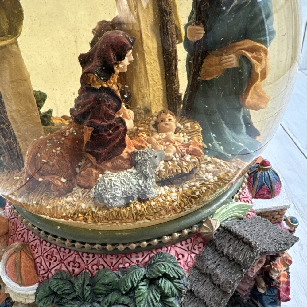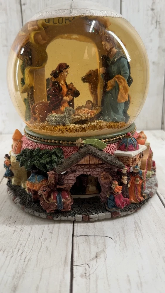 GRANDEUR NOEL Nativity Scene Musical Water Globe the First Noel Base Revolves Some water evaporation. No other flaws found. Comes with original box and foam insert. Box does have shelf wear and is missing the lid Used item stored in a smoke free home One business day handling. Sales on Friday, Saturday, or Sunday are mailed on Monday.