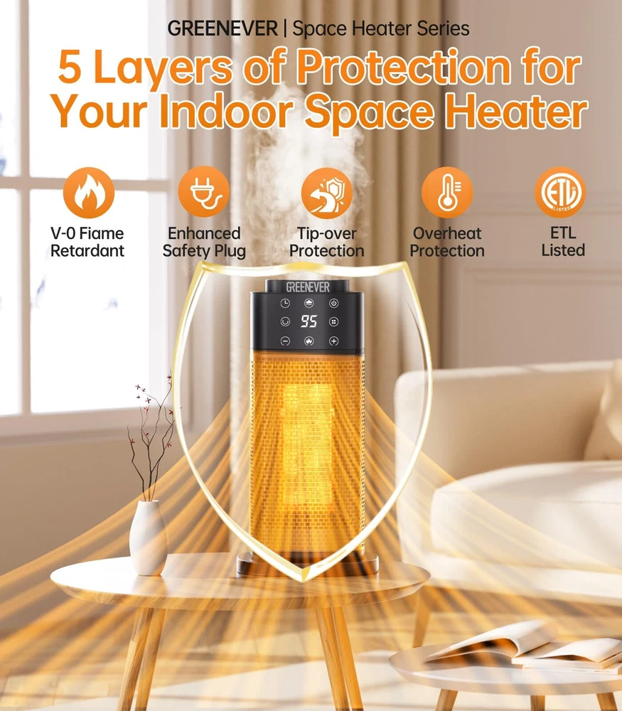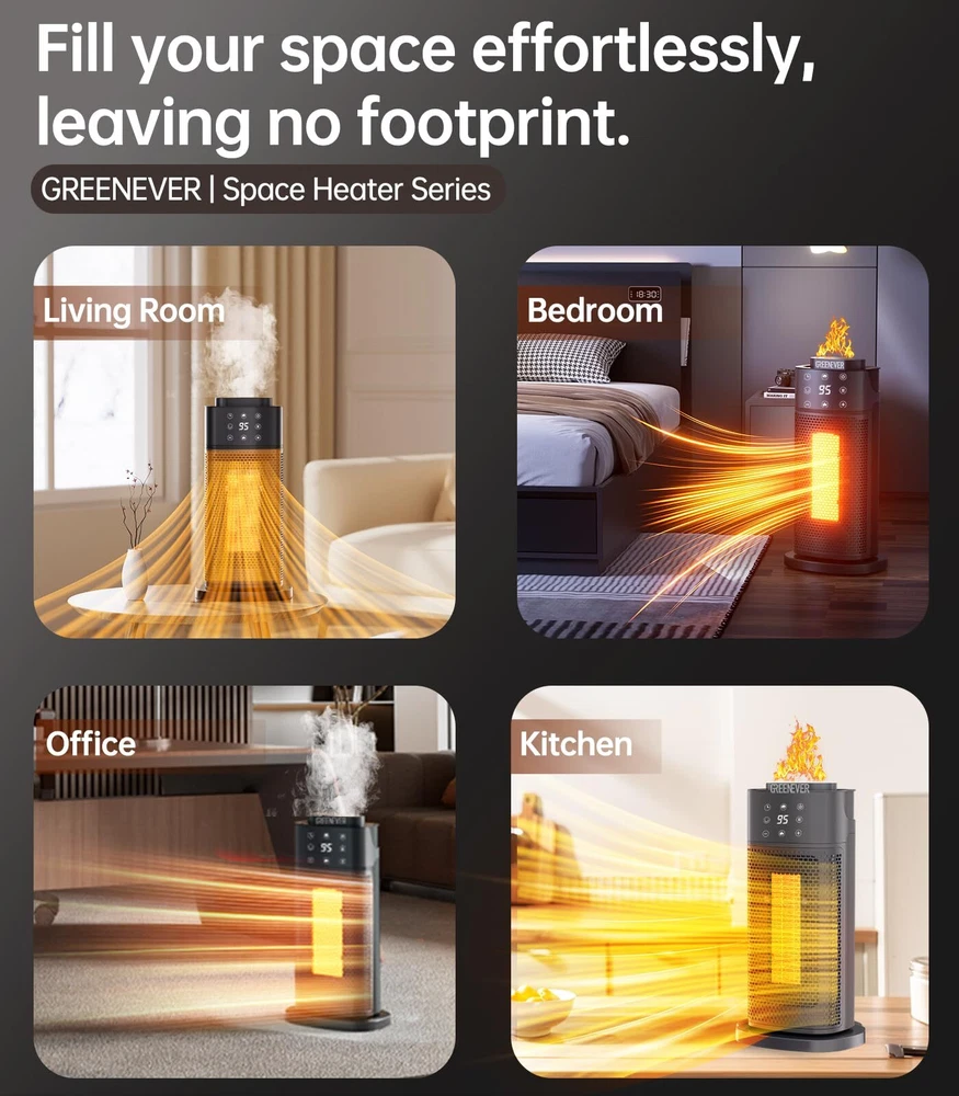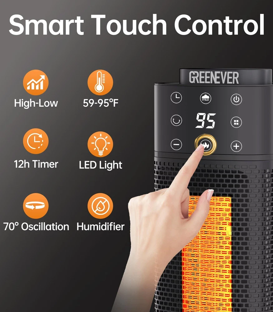 GREENEVER Space Heater Indoor with Humidifier: 2024 Upgraded PTC Electric Heaters with Thermostat, 1500W Ceramic Safety Heater Fast Heating with Remote, Oscillation, Timer for Home Bedroom, Office Dual-Function Heater & Humidifier: Stay warm and maintain ideal indoor humidity with GREENEVER 2024 upgraded space heater. Combining efficient heating and a built-in humidifier, it ensures a cozy and comfortable home, even on the coldest days Comprehensive 5-Layer Safety Protection: Equipped with V-0 flame retardant materials, an enhanced safety plug, tip-over protection, overheat protection, and ETL certification. Your safety is our priority, ensuring peace of mind with every use Rapid Heating & Versatile Use: Featuring 4th Gen 1500W PTC Ceramic Technology, this heater delivers quick warmth in seconds. Perfect for any indoor space—bedrooms, living rooms, offices, garages, and yoga studios—ensuring efficient and reliable heating Quiet Heating for Peaceful Nights: Enjoy undisturbed sleep with our space heater, keeping noise below 40 dB. With advanced airflow technology, it’s 12% quieter than traditional heaters, ensuring a calm environment for restful nights Energy Efficient ECO Mode: Save over 45% on energy bills with our built-in ECO mode. The smart thermostat adjusts heating based on ambient temperature, optimizing efficiency and reducing power consumption compared to traditional heaters More Features Than Expected: Enjoy added convenience with our space heater's 12-hour timer, touch and remote controls (batteries not included), carry handle, night light with flame imitation, and a washable, detachable filter. It’s designed to enhance your comfort and ease of use