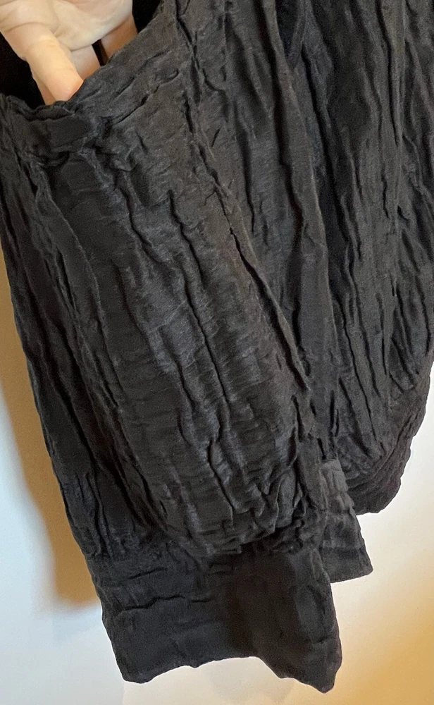 GRIZAS Women 60% Linen 40% Silk Pants are designed with a wide-leg, relaxed fit and a high-rise elastic waist, making them comfortable for casual wear or travel. The pants feature a solid black color in a chambray fabric with lage pockets for added style and convenience. Made of a linen and silk blend, these oversized pants are perfect for a relaxed and chic look in size Medium with a 30” to 40" (max stretch) waist size. Excellent condition. Please check my other listing for a matching blouse.