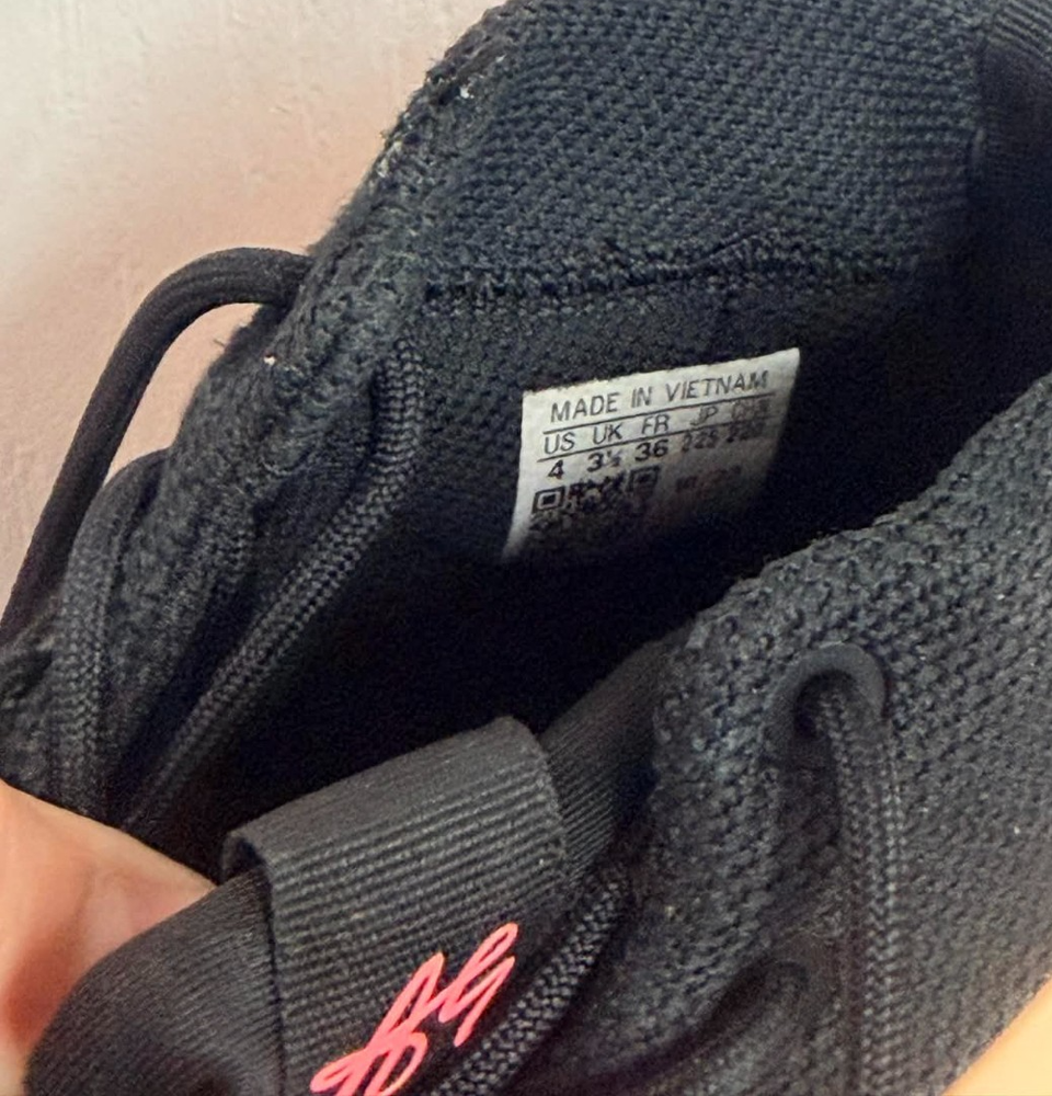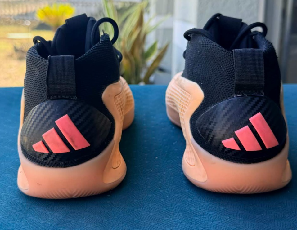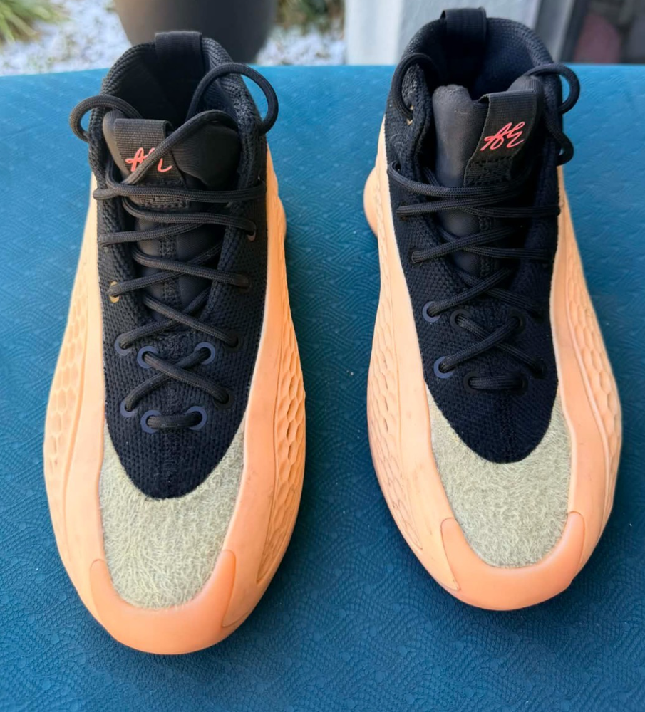 The product is a pair of GS Size 4y Adidas Anthony Edwards AE1 J sneakers in the color orange, featuring a round toe, lace-up closure, and mid-top shoe shaft style. These sneakers are designed for activewear and casual occasions, with a rubber outsole for traction and comfort. The upper material is synthetic, with a foam insole for added comfort, making them ideal for basketball and other athletic activities. The shoes also include the Adidas logo as accents, embodying a sporty theme perfect for young boys who love to be active.