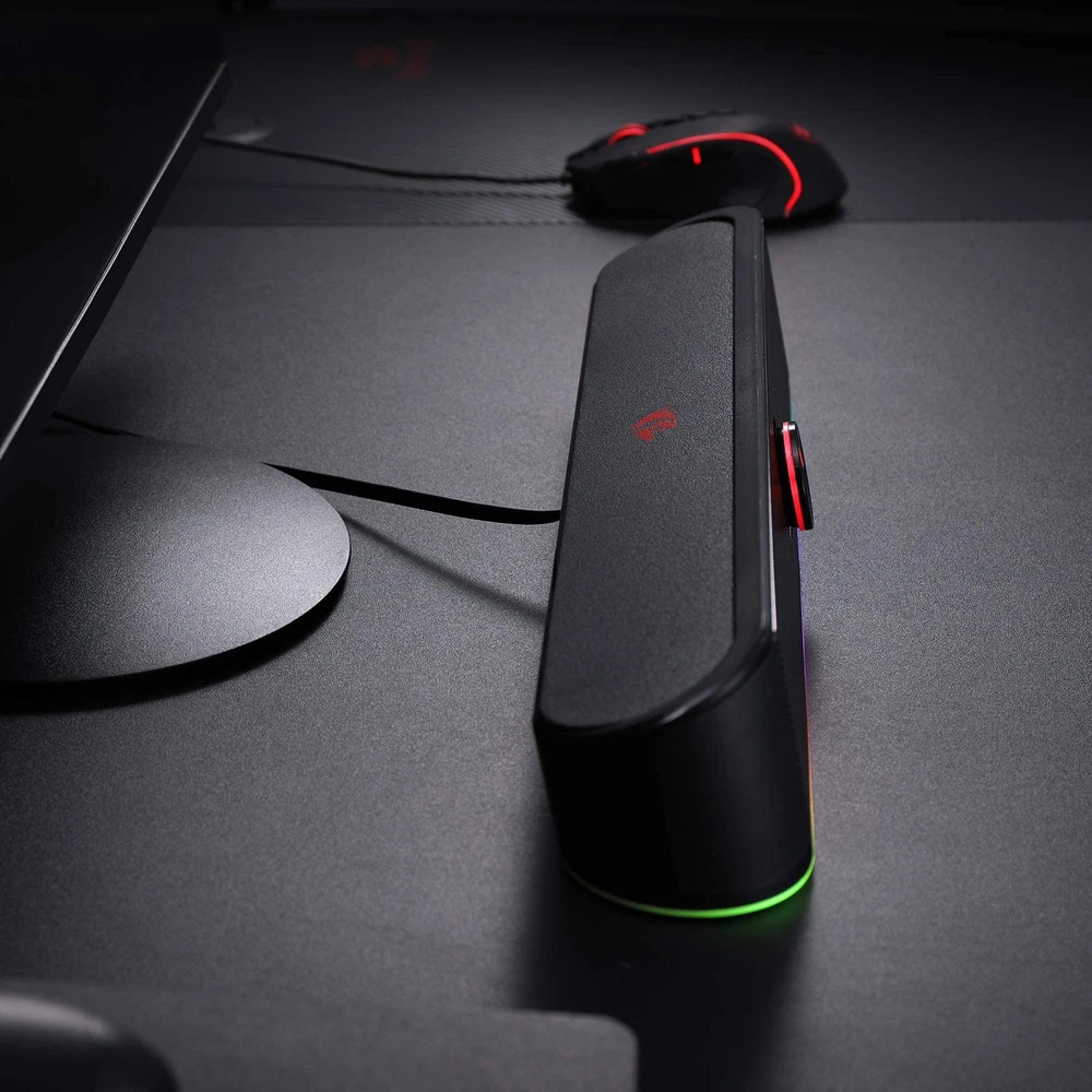 Rich Sounds & Look - The first RGB sound bar has the upgraded driver that delivers clear and crystal sound quality combined with rich bass. 4 different backlit modes includes both dynamic and static glowing LED illumination. Lightshow Projection - What's better than play your favorite music while gaming or working? An illuminating backlight show sync to the playing music. Classic with RGB, you can sit and watch this all day. Bounce to Daylight - Easy to place it underneath any device you have, about 16 inches compact size suits perfect for your audio system. Whether you’re feeling Wave, Disco, Rain, or something in-between, start bouncing with your music today. Handy Volume Knob - Delicate and compact volume knob combined with on/off switch offers you a convenient and precise volume adjustment. Plug & Play for Broad Compatibility - USB powered with 3.5mm audio and mic cables allows this rockstar to party on wide type of stages for PC, TV, Laptop and Smartphone. Get it all connected well on your device and spice up your next party.