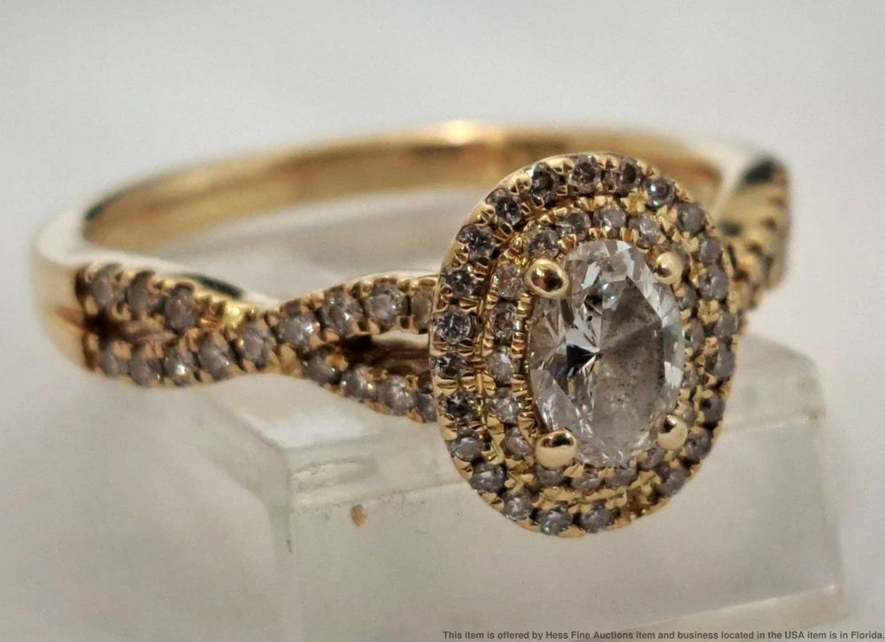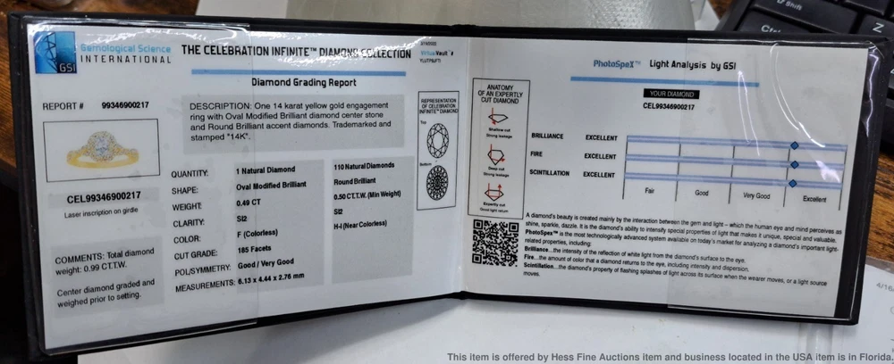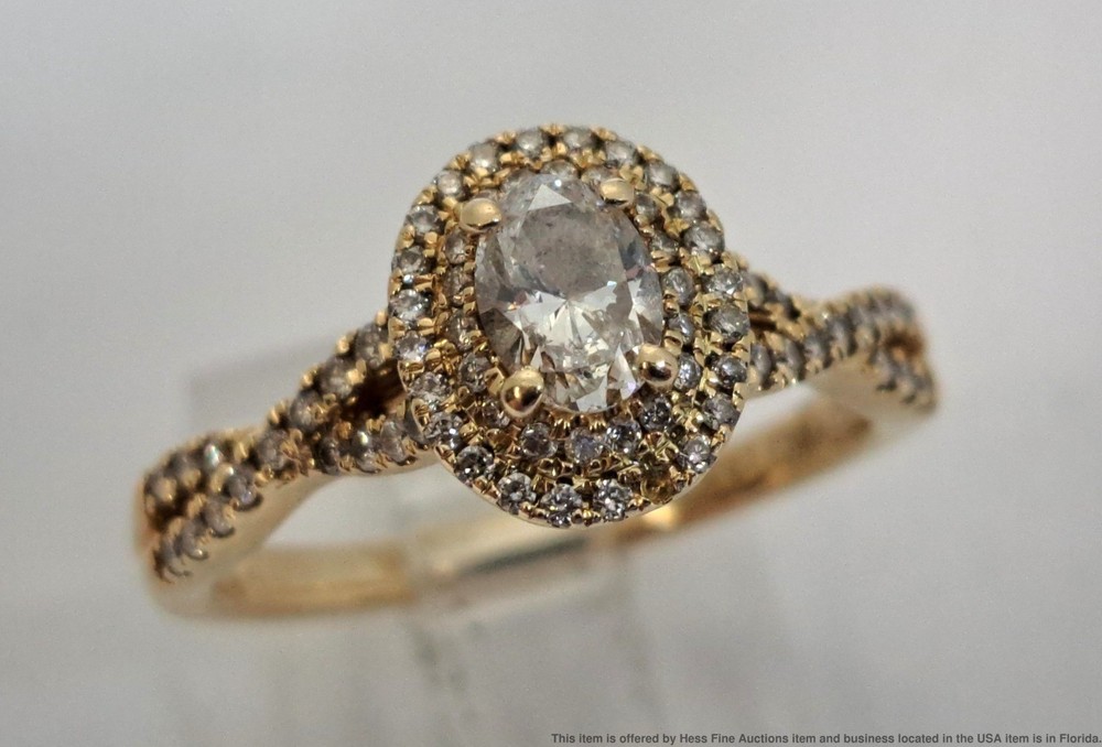 GSI .49ct Oval Center .99ctw Fine Natural Diamond 14k Gold Engagement Ring GSI .49ct Oval Center .99ctw Fine Natural Diamond 14k Gold Engagement Ring Click images to enlarge Description Described & Photographed By: Mike NFEDD 71201 Title: GSI .49ct Oval Center .99ctw Fine Natural Diamond 14k Gold Engagement Ring Description: Beautiful! Make it yours today. Happy bidding! Here are the specifications Please note; all stones graded, measured & calculated while mounted Type of Jewelry: Ring Gemstones: Diamond Approx. Measurement or Weight of Stones: Oval cut Diamond totaling .49ctw Side stones totaling approx. .50ctw Clarity: SI2 Color: F H-I Mounting Metal: 14k Yellow Gold Approx. Size or Length: 8.5 Stamps or Factory Markings: 14k, hallmarks, Celebration Total Weight of Item: 4.7 grams Condition: Gold shows very minor toning or wear. All stones are well secure and intact. Please note it appears one of the Diamonds is missing. Estimated size of package: 7.5in X 5.5in X 3.5in Estimated total weight of package: 8 oz Please Note: If the winning bidder would like to arrange to pick up their item at our store then please notify us by email & we will make the appropriate shipping adjustments. Condition: Pre-owned - Excellent Condition Notes: Described & Photographed By: Mike NFEDD 71201 Title: GSI .49ct Oval Center .99ctw Fine Natural Diamond 14k Gold Engagement Ring Description: Beautiful! Make it yours today. Happy bidding! Here are the specifications Please note; all stones graded, measured & calculated while mounted Type of Jewelry: Ring Gemstones: Diamond Approx. Measurement or Weight of Stones: Oval cut Diamond totaling .49ctw Side stones totaling approx. .50ctw Clarity: SI2 Color: F H-I Mounting Metal: 14k Yellow Gold Approx. Size or Length: 8.5 Stamps or Factory Markings: 14k, hallmarks, Celebration Total Weight of Item: 4.7 grams Condition: Gold shows very minor toning or wear. All stones are well secure and intact. Please note it appears one of the Diamonds is missing. Estimated size of package: 7.5in X 5.5in X 3.5in Estimated total weight of package: 8 oz Please Note: If the winning bidder would like to arrange to pick up their item at our store then please notify us by email & we will make the appropriate shipping adjustments. Payment Paypal Shipping Shipping Options: Domestic shipping: Weight based Shipping Charges. Domestic Carriers are: Ups Second Day Air, Ups Next Day Air International shipping: Weight based Shipping Charges. International Carriers are: Ups Standard Canada, Ups Worldwide Expedited I will ship to: United States, Worldwide Weight: 8 oz. Shipping and Handling: Please check eBay's Shipping & Payment tab Customer Service Policy: Please note in bidding or buying this auction you are entering into a binding contract. In bidding or buying you are agreeing to all policies stated below and comply with Florida State laws. Sales Tax applies to all Florida sales unless you have a valid dealers license. Legal Shipping High value items require restricted delivery with only the addressee being able to sign for it. * Shipping is calculated by eBay and shown in the auction. Legal Jurisdiction. HessFineAuctions is a division of Hess Fine Art, and is registered in Pinellas County, FL, USA. It is agreed that all parties will abide by the laws of the State of Florida in all matters relating to this agreement. And that in the case of any dispute, the legal jurisdiction of resolution shall be Pinellas County, Florida. The buyer acknowledges that any items not returned within 30 days of receipt of the refund will be deemed appropriated by the buyer and buyer also acknowledges their intent to deprive from seller, either temporarily or permanently, the right to the property or the benefit from the property. Resale certificates must match buyer name or company and address * The auctions contain only what is described. Do not assume something comes with a used item if it is not stated in the auction verbiage. Many items will be marked with serial numbers or identifying numbers items may not be accepted for return if these numbers are not present. * Photographs often disclose condition far better than verbiage as many people have different ideas on what terms may mean. * If an identifying mark, inclusion or defect is visible in the images it is considered DISCLOSED to the buyer. * Gold items have been tested with a Kee gold tester M-509GM and tested as stated in the auction. * All Items are shipped insured. If an item has arrived damaged we will require images and a damage affidavit. CUSTOMS AND INTERNATIONAL BIDDER POLICIES International bidders - you are agreeing to the following when you place a bid with us: * If your total purchase including shipping exceeds $200.00 US and you pay with a credit card then your only delivery option is UPS signature delivery. This is because credit cards require both a signature and tracking. * If you pay with PayPal and the total price including shipping is less than $750.00 US then we can ship USPS to most countries. Please contact us with eBay?s message system before you pay for an amended invoice. * The following applies if you are shipping to or from these countries. CANADA, Australia, Belgium, Brazil, Croatia, Denmark, France Germany, Great Britain and Northern Ireland, Israel, Netherlands New Zealand Spain and Switzerland, Estonia, Finland, Gibraltar, Hungary, Italy, Latvia, Lithuania, Luxembourg, Malaysia, Malta, Portugal, and Singapore. We will be able to offer you USPS International shipping if you are paying with PayPal and the item and shipping are less than $750.00 US. We may be able to ship 1st Class USPS International if you are shipping to or from the countries listed above. * If you wish your item sent to a colleague with a US address we are of course willing to do so but the address must be verified with PayPal Credit card company and in the eBay invoice. * We declare all items for the winning bid amount. * It is common for countries to char