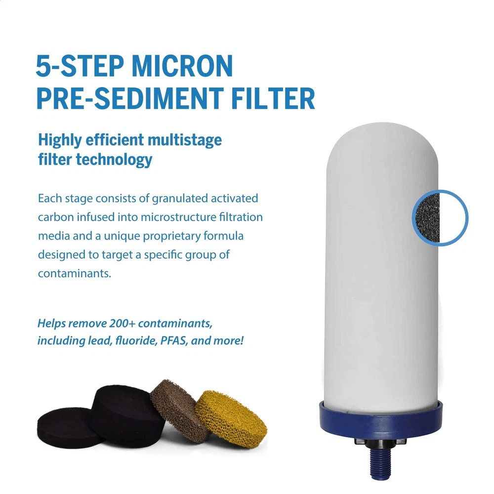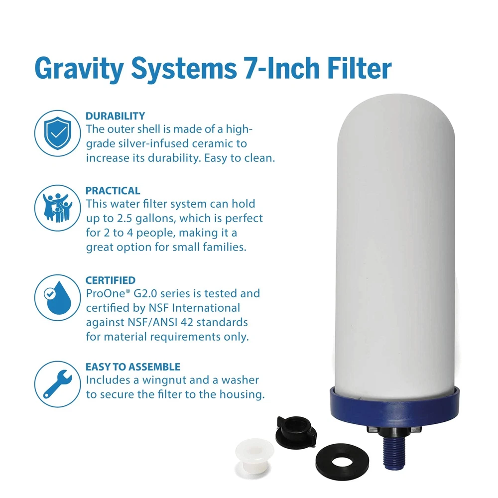 Whether you need a drinking-water filter system for your home or an emergency water-filter system for natural disasters, our gravity water-filter systems operate without the use of plumbing or electricity, so they’re a great camping water filter or emergency option when the power goes out. This replacement water filter helps your system continue to remove chemicals and harmful contaminants to ensure that you and your family have safe, great-tasting water. It’s designed for use with the Big+ and Big II countertop gravity water-filter systems. Each filter lasts up to 6 months with daily use. Keep an extra water filter in your pantry or RV storage to make sure your family has access to clean water anytime. You don’t have to be a survivalist or prepper to understand the value of clean, safe drinking water. offers affordable water filtration systems to help improve the quality of your water. Our products are uniquely engineered to help reduce undesirable contaminants and water pollutants. We’ve got the science you can trust and the quality you can taste. At , we’re committed to innovation, extensive testing, and exceptional customer service. With our wide variety of products, there’s a water filter for everyone! REPLACEMENT WATER PURIFIER FILTER: With so many chemicals and contaminants out there, everyone needs a reliable water filtration system. With this replacement filter for the Big+ or Big II Countertop Gravity Water Filter Systems, you'll never run out of clean water. WATER GRAVITY FILTER: Our filters help remove contaminants from your drinking water. Beneficial minerals such as calcium are left behind for great-tasting, healthier H2O that your entire family can enjoy worry-free.NSF/ANSI-42 component certified. Independent lab tested to other NSF standards. PORTABLE WATER FILTRATION SYSTEM: Our filters don't require any priming. Easy to clean. This makes them perfect to use anywhere! The all-in-one filtration is ideal for use with most water sources, including lakes, rivers, streams, ponds, rain, and tap water. LONG-LASTING FILTERS: Each filter will last up to 6 months with regular daily use. Our filters are infused with silver to help prevent unwanted contaminant growth, leaving you with convenient, worry-free drinking water. SURVIVAL AND EMERGENCY WATER FILTER: This portable water filtration system functions without electricity. Even without power, you'll have access to clean water. This water filter will be there whether you're fighting through a natural disaster or going on a camping trip or just daily use.