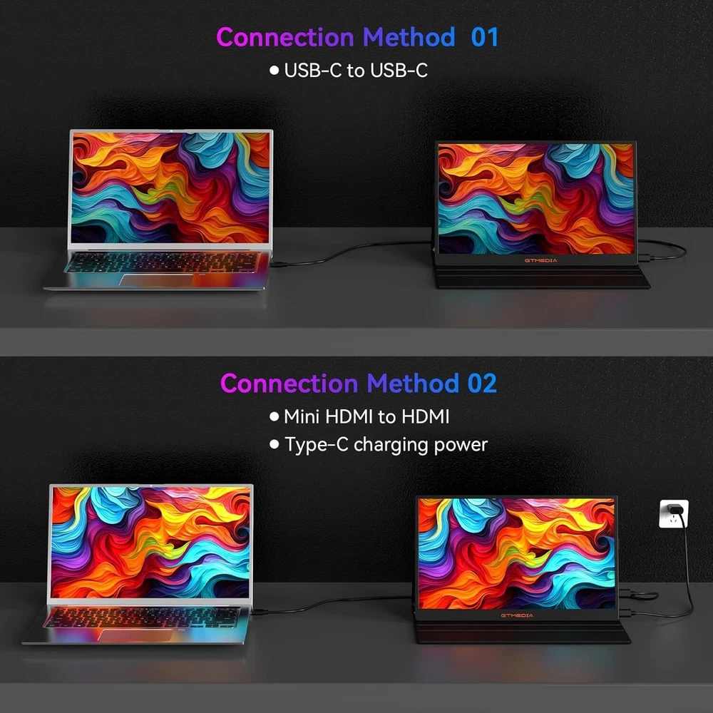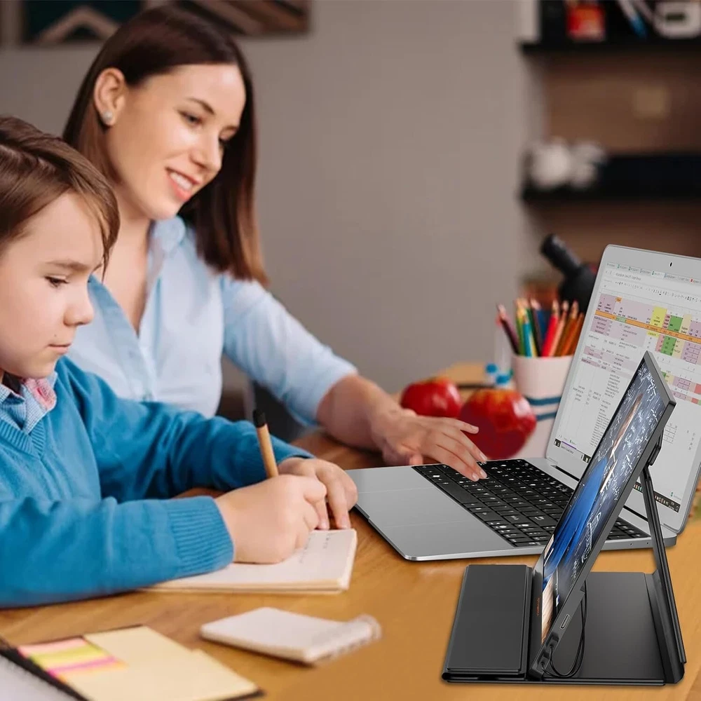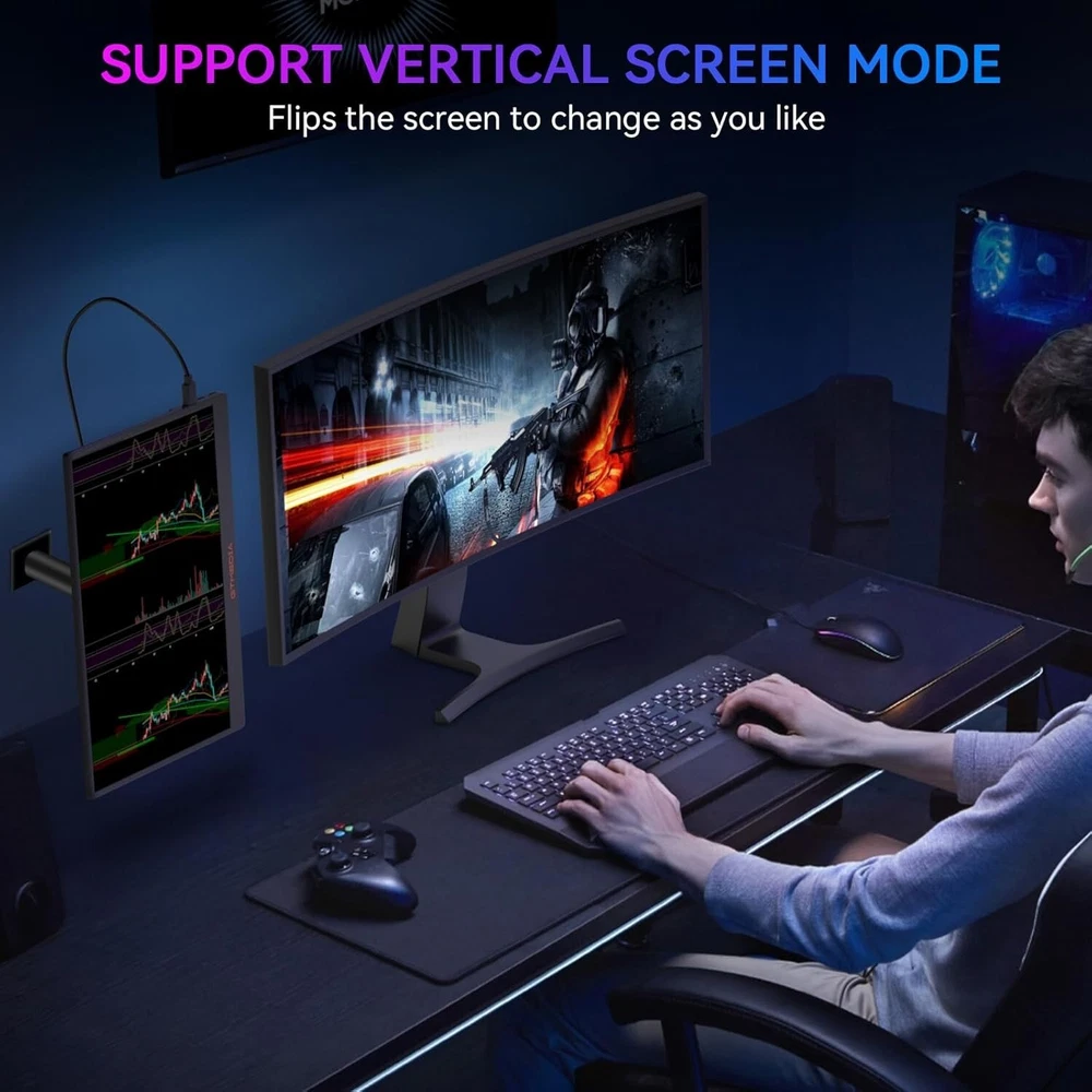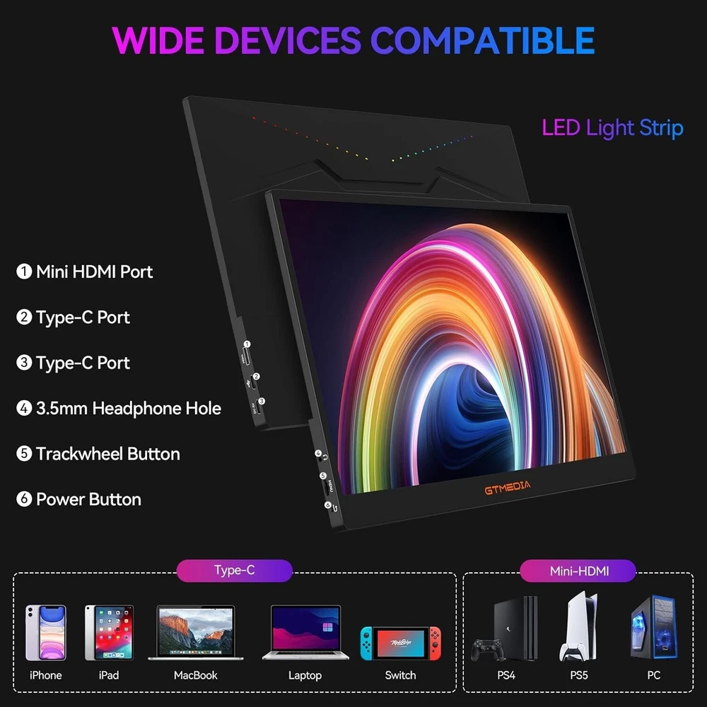About this item 🎮[2.5K 165Hz(DP)/144Hz(HDMI) portable gaming monitor] This portable monitor with 2560*1440(2.5K) resolution and advanced IPS glossy screen supports 178° full viewing angle for accurate and bright colours, the monitor portatil 165Hz(DP)/144Hz(HDMI) high refresh rate ensures smooth and fluid gameplay, reduces motion blur, and brings you into the video or game with realistic colours and stunning details. 🎨[100% sRGB laptop screen extender monitor portable]This portable monitor 16.7M Display Color,1000:1 Contrast,300cd/㎡ Brightness,100% sRGB Color Gamut's vibrant and accurate colours provide you with brighter highlights, more realistic colours and images, improving the visual quality of your games. 💻[17.3'' large screen portable monitor]:This 17.3-inch portable monitor offers plenty of visual space for improved game play, increased productivity, and enjoy a larger, more immersive gaming experience when used as a laptop screen extender. Whether you're battling enemies in your favourite game or expanding your workspace while working remotely, the large screen size of this portable monitor provides plenty of room for immersive gaming and increased productivity. 📺[Multiple usage modes] This portable monitor for laptop has multiple usage modes. Extend, copy, second screen and other modes can broaden your view and improve your work efficiency. Also, this monitor supports landscape or portrait screen, equipped with a leather cover with protection and stand function, you can adjust the height and angle for a comfortable viewing experience, reduce eye strain and neck fatigue. 🔆[Widely compatible]:This travel monitor for laptop is equipped with 2 full-featured Typ-c ports and 1 HDMI port, which can be easily connected to your laptop or gaming console with just a single cable without the need for additional drivers or software installation, providing hassle-free setup and instant gaming action. This portable display is compatible with most mobile phones, laptops, Steam Deck, Switch, PS5/4. Product Description Previous page Next page Previous page