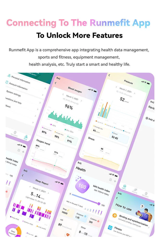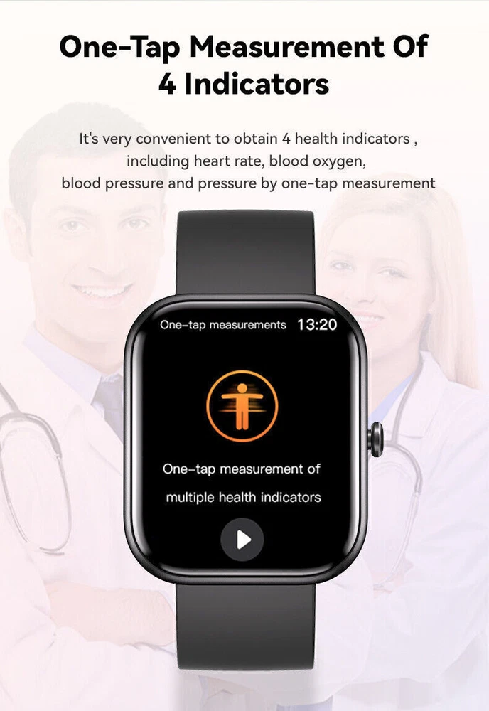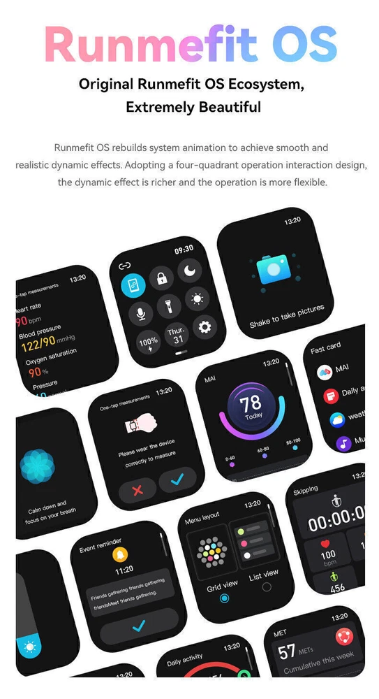 About this item Smart Communication: Our Android smartwatch lets you answer and make calls directly from your wrist. With a built-in microphone and speaker, you can enjoy hands-free communication, making it a smarter choice compared to similar devices. You can also receive SMS and app notifications (WhatsApp, Facebook, Messenger, Instagram), although replying to messages directly from the watch is not supported. Comprehensive Health Monitoring: This smartwatch is designed for both men and women, providing 24-hour heart rate monitoring, blood-oxygen saturation measurement, and blood pressure monitoring. It also tracks your sleep patterns, offering valuable insights into your sleep quality and helping you establish healthier sleep habits. With its focus on your well-being, it becomes your ideal health companion. Stunning HD Touch Screen & Customization: The smartwatch boasts a full touch screen with an elegant metal frame. You can adjust screen brightness for optimal visibility. It offers a variety of watch faces, and you can even create your own through the accompanying app. The watch can be locked, and it wakes up automatically when you raise your wrist. Versatile Sports Modes & Waterproof Design: This smartwatch supports an impressive 100 sports modes, tracking your performance metrics during activities like running, cycling, hiking, and more. It records steps, distance, calories burned, and active minutes. With an IP67 waterproof rating, it can withstand sweat and rain, ensuring you can wear it during most activities. However, it's not suitable for diving, swimming in the sea, or sauna sessions. Multi-Functional Compatibility: Compatible with iOS 8.0 and Android 4.4 and above, the smartwatch offers a wide range of features, including built-in speaker and microphone, phone call management, contact synchronization, sleep monitoring, heart rate monitoring, blood pressure monitoring, blood oxygen monitoring, breath training, pressure measurement, MET tracking, calculator, screen lock, IP67 waterproofing, 100+ sports modes, customizable watch faces, message and notification management, calorie counting, alarm clock, female health tracking, weather updates, camera control, timer, stopwatch, and music playback control. Number Table of Contents Product Parameters 1 Basic Parameters Bracelet Size (mm) L*W*H=45.6*38*12.8mm Weight 30.8g Colors Black APP Runmefit Compatible System Android 4.4, iOS 9.0 and above FLASH Memory 64MB Display Type TFT color screen Screen Size 2.0-inch Resolution 240*282, RGB Touch Type Full-screen multi-touch 2 Connection Parameters Bluetooth Bluetooth 5.2 3 Sensors G-Sensor SC7A20E Heart Rate LC11S 4 Battery Battery Type Lithium polymer battery Capacity 350mAh Charging Method Magnetic charging 5 Major Functions Special Functions: MAI Health and Vitality Index, One-Tap Measurement, Event Reminder, Media Output Shifting, Voice Assistant Wake-up, etc. Health Monitoring: Sleep Monitoring, Heart Rate Monitoring, Blood Pressure Monitoring, Blood Oxygen Monitoring, Stress Monitoring, MET Sports Tracking: 100 Sports Modes, GPS Track Record, Daily Activity Details and more. Other Functions: Music Control, Weather, Breathing Training, Watch Face Market, Custom Watch Face, Call Reminder, Drinking Water Reminder, Sedentary Reminder, SMS Notifications, Women's Health, Alarm Clock, Remote Control Camera, and more. APP Notifications: Support all mobile phone notifications Support Bluetooth calls and music control Supported Watch Languages: Simplified Chinese, Traditional Chinese, English, Japanese, German, Italian, French, Spanish, Russian, Dutch, Korean, and Thai. Supported APP Languages: Simplified Chinese, Traditional Chinese, English, Japanese, German, Italian, French, Spanish, Russian, Dutch, and more. 6 Other Parameters Waterproof Level IP67 Charging Time 2.5-3H Battery Life 7-13 Days of use, 60 Days of standby Wristband Size Total length 253mm, adjustable range 120-200mm Appearance Material Middle frame: zinc alloy; Bottom shell: PC; Side button: aluminum alloy; Wristband: silicone 7 Package Dimensions Box Size (L*W*H, mm) 270*95*15mm Box Weight (g) Carton Size (L*W*H, cm) 49.5x28.2x49.8cm Carton Weight (kg) Carton Quantity (Pcs) 150pcs