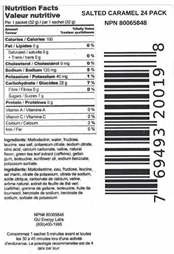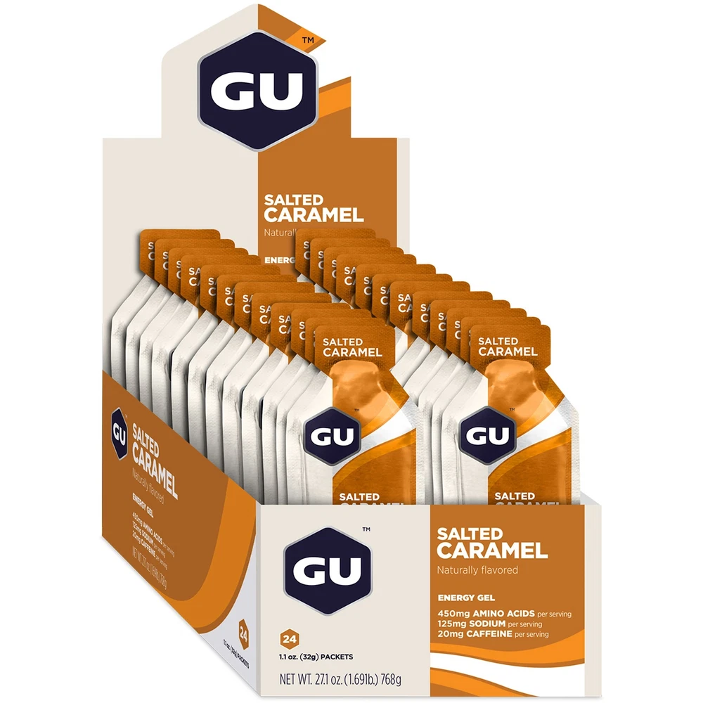 GU Original Sports Nutrition Energy Gel is the energy gel that started it all. In 1993, Dr. Bill Vaughn developed the world’s first energy gel to help his daughter perform better during ultra-marathons, and GU has been helping to propel the world’s most successful extreme athletes to success ever since. sustains all forms of athletic activity with a highly compact, portable, and calorie-dense packet that is loaded with carbohydrates that can be rapidly absorbed. Branched-chain amino acids limit muscle fiber damage and increase speed of recovery, and extra electrolytes help maintain water balance. Some flavors feature caffeine to increase concentration. While the original formula has been tweaked and evolved over the years, the end result is still the same: GU Energy Gels fuel the best endurance athletes in the world. GU Original Energy Gel comes in a wide variety of good tasting flavors. Each packet contains 450mg of Amino acids, 100 calories, and at least 21g total carbs. The Original Sports Nutrition Energy Gel designed to help athletes perform their best; 100 calories and essential electrolytes in a portable packet Dual source energy from maltodextrin and fructose that use non-competing pathways for efficient absorption and lasting energy whether running, biking, hiking, or skiing Use for training or racing year-round! Take one packet 5 minutes before and every 45 minutes during activity Branched-chain amino acids to help decrease muscle damage and mental fatigue Salted Caramel contains 20mg Caffeine, 125mg Sodium, 40mg Potassium. Vegan and Gluten Free.