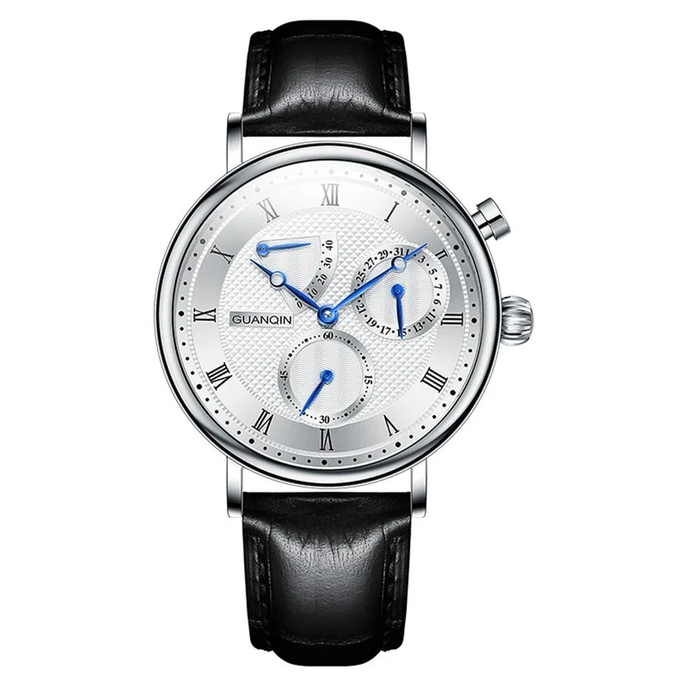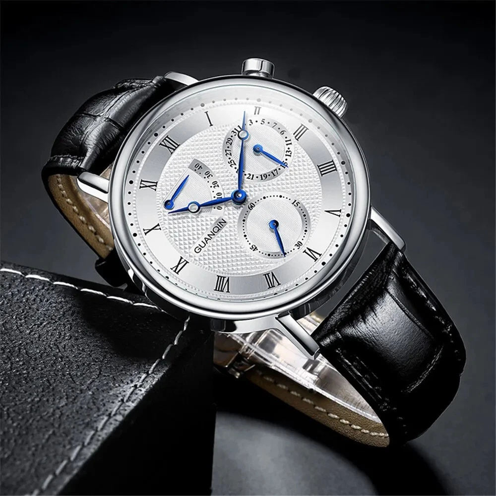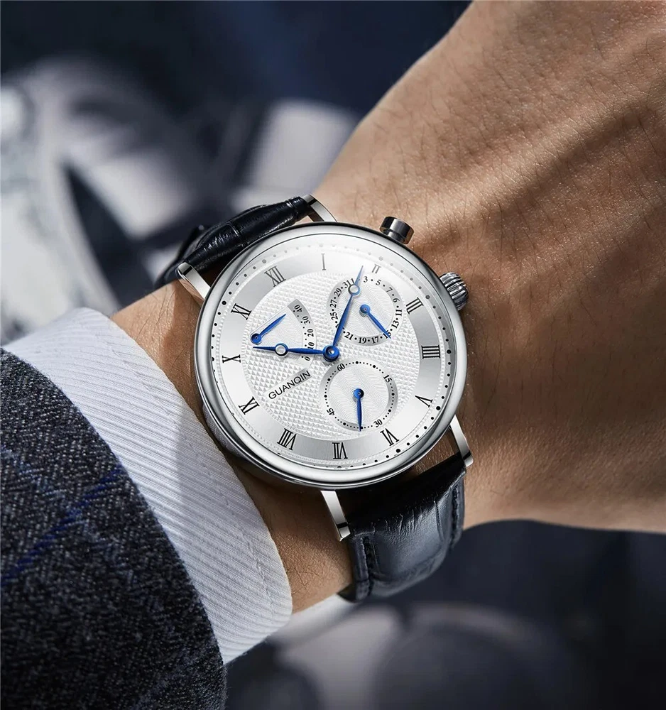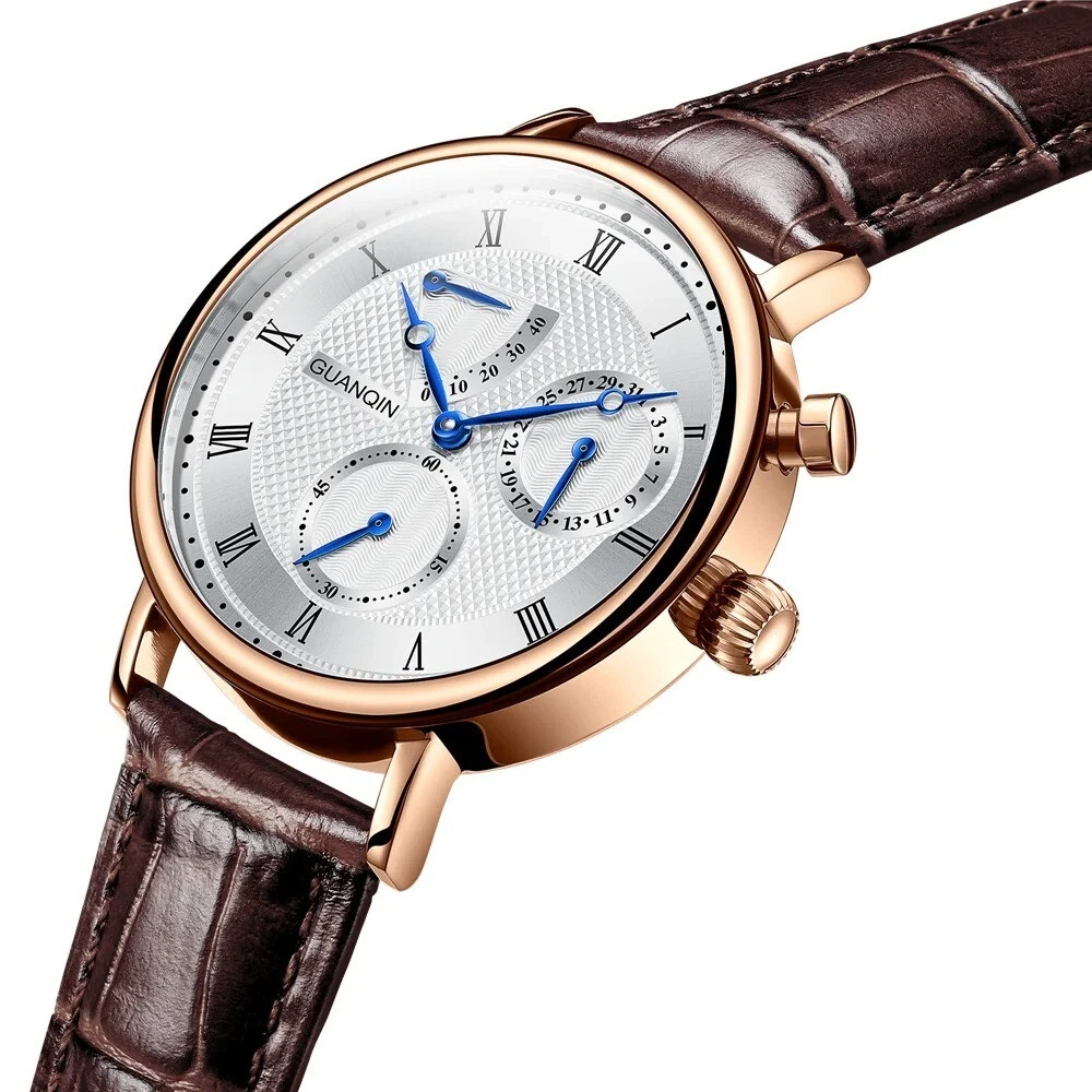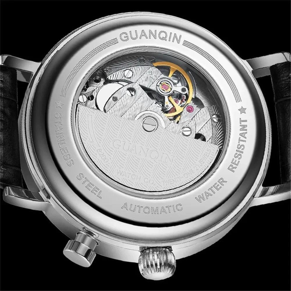 GUANQIN Sapphire MIYOTA Mechanical Automatic Men's Watch Date Sterile Dial Leather Case Shape - Round Case Thickness - 12mm Band Width - 20mm Band Material Type - Leather Boxes & Cases Material - Leatherette Dial Window Material Type - Hardlex Feature - Shock Resistant, Complete Calendar, swim Dial Diameter - 40mm Water Resistance Depth - 5Bar Clasp Type - Push Button Hidden Clasp Band Length - 22inch Case Material - Stainless Steel Style - Business Movement - Automatic Self-Wind Brand Name - GUANQIN