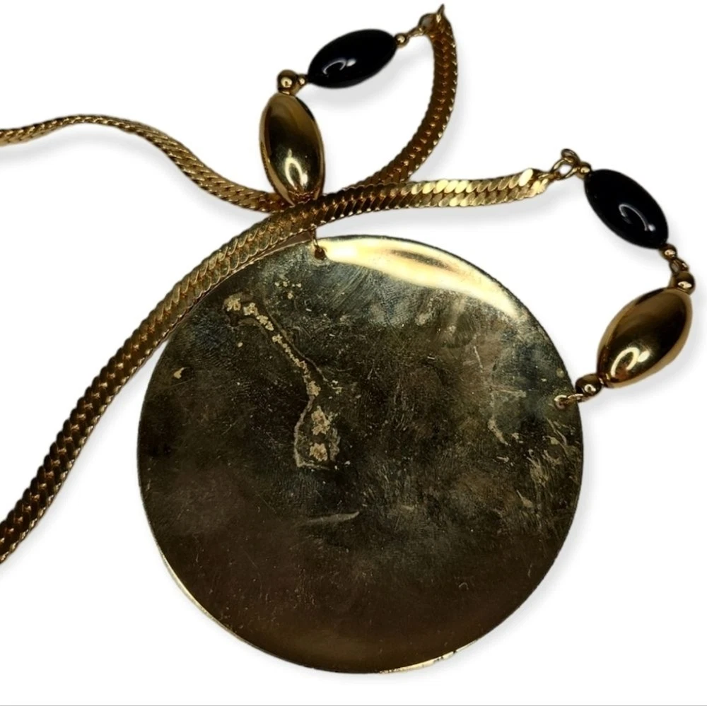 This is a very cool vintage piece - a gold tone medallion on a great herringbone chain. The disc is painted in red and black and does have some marks on the back, but overall the piece is in great shape!
