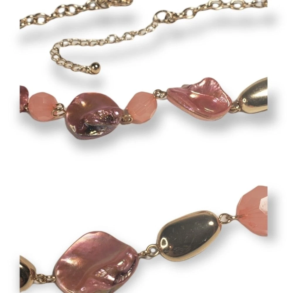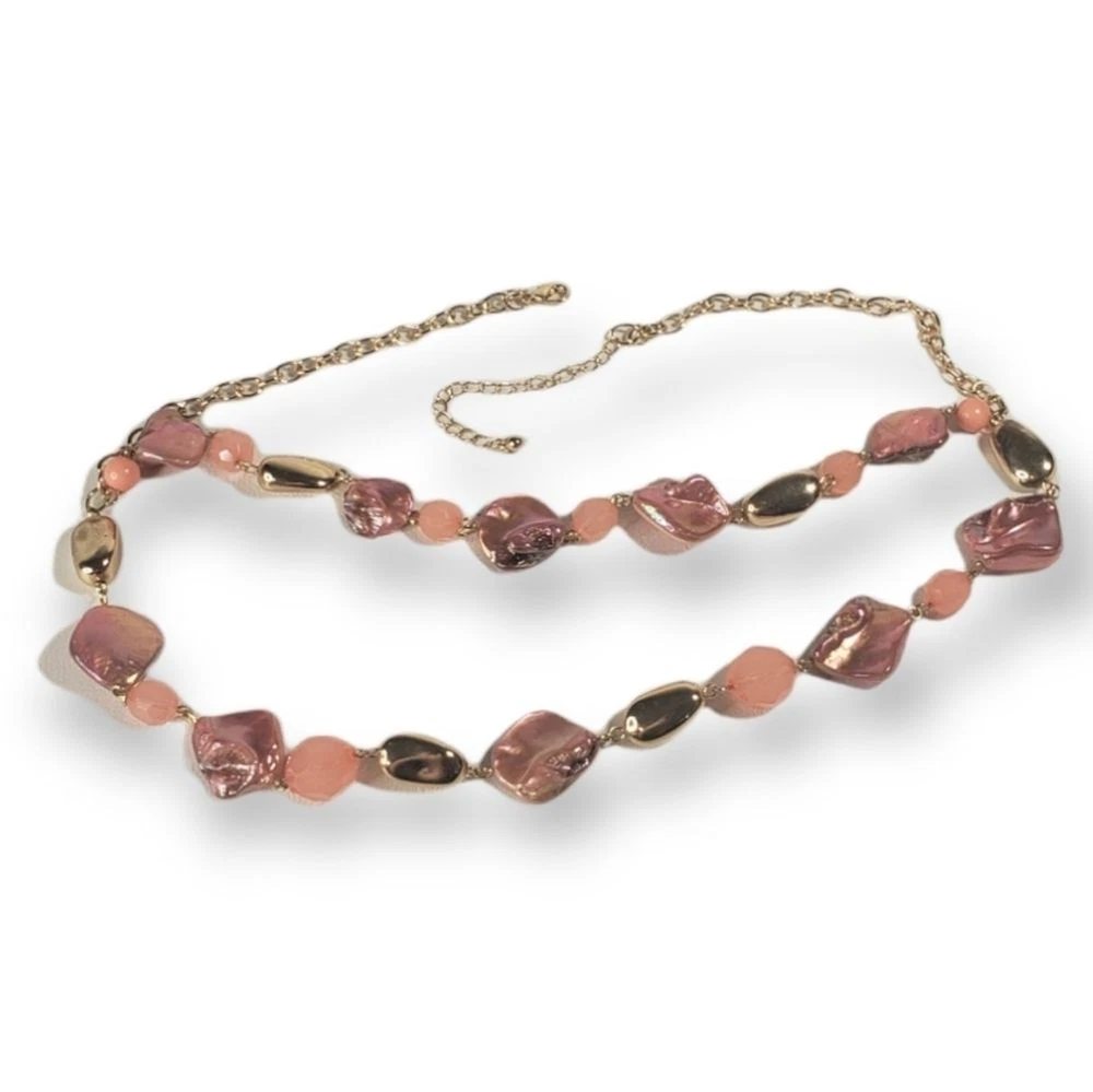 This necklace is a beautiful, soft pink with iridescent shells and faceted stones mixed with faux gold stones in a gold tone chain. Honestly, I'm not 100% sure the materials used, but still very pretty with a natural air to it. The shortest chain measures about 21", about 24" for the longest.