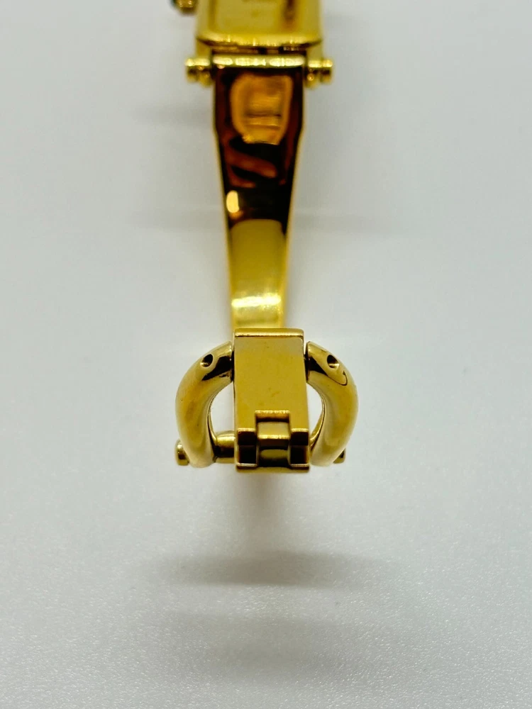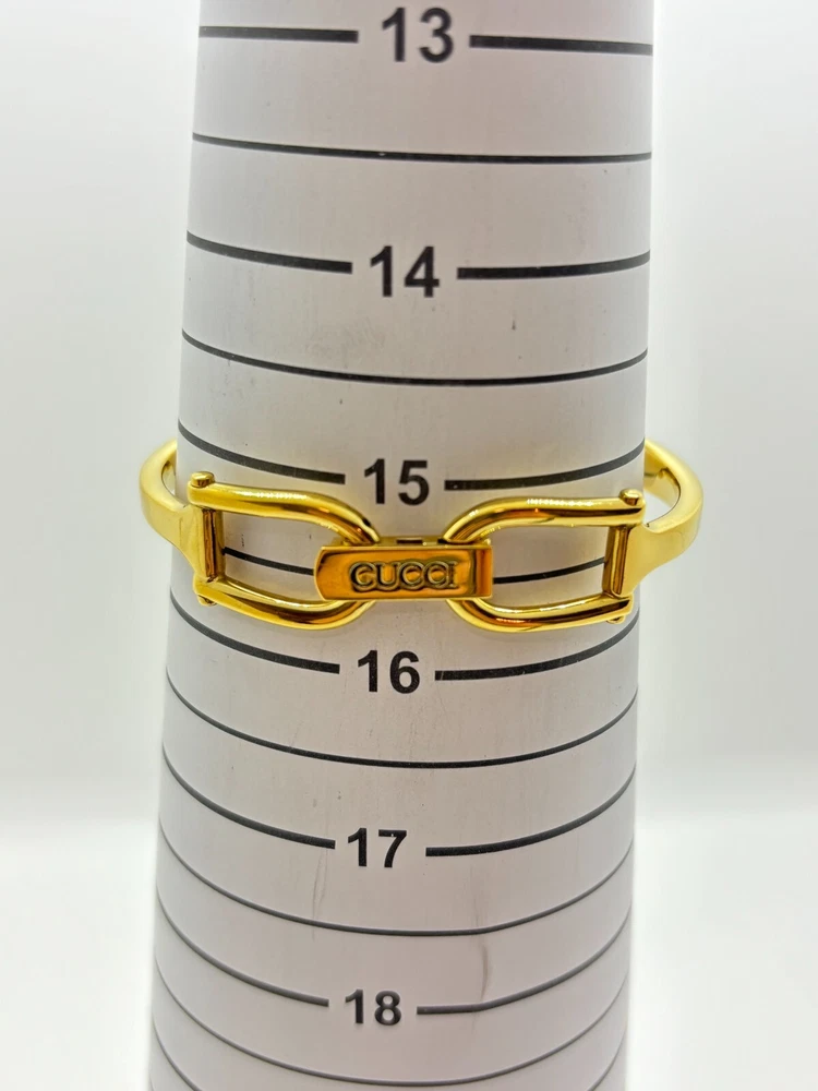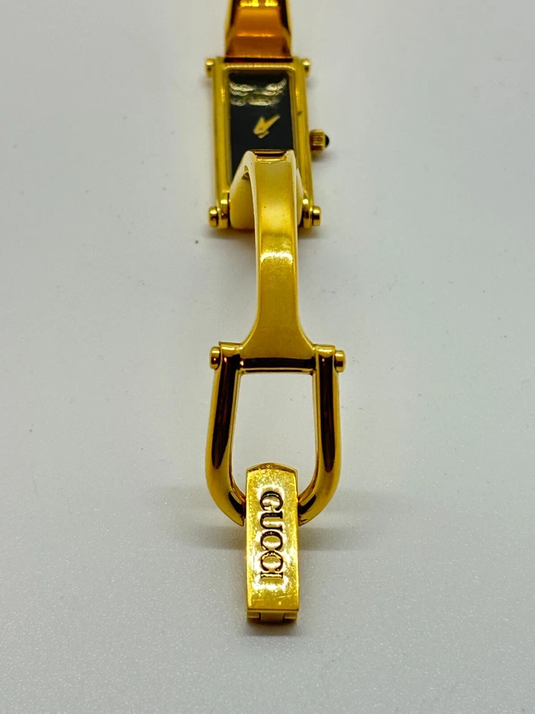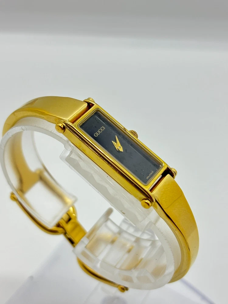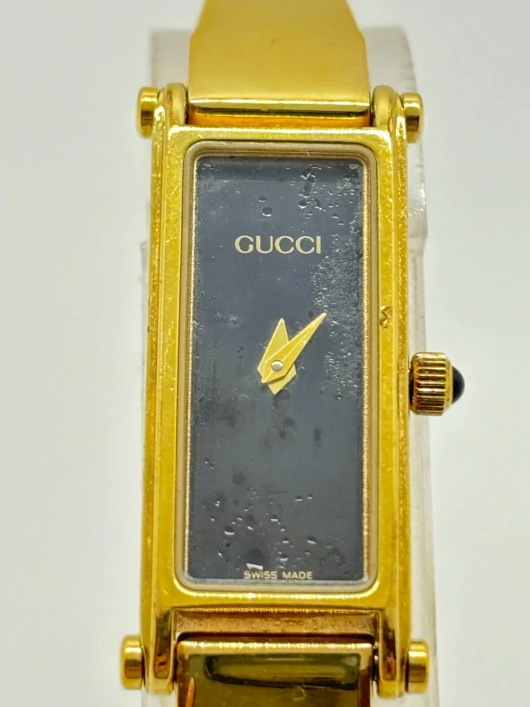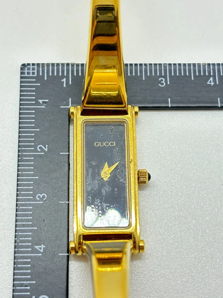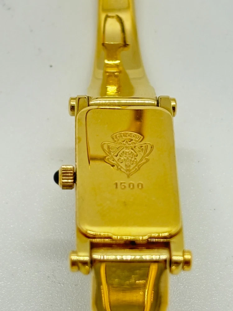 Reference Number: 1500 Display: Analog Model: 1500 Features: 12-Hour Dial Country/Region of Manufacture: Japan Water Resistance: does not apply Bezel Color: Black Seller Notes: “Please check photos and description” Case Size: 30 mm Type: Wristwatch Number of Jewels: does not apply Case Material: Gold Plated Dial Color: Black Case Color: Gold UPC: Does not apply Department: Women Indices: does not apply Brand: Gucci Band Material: Gold Plated With Original Box/Packaging: Yes Year Manufactured: does not apply Band/Strap: Bangle Watch Shape: Rectangle gtin13: Does not apply With Papers: No Movement: Quartz Style: Casual, Classic, Luxury Band Color: Black