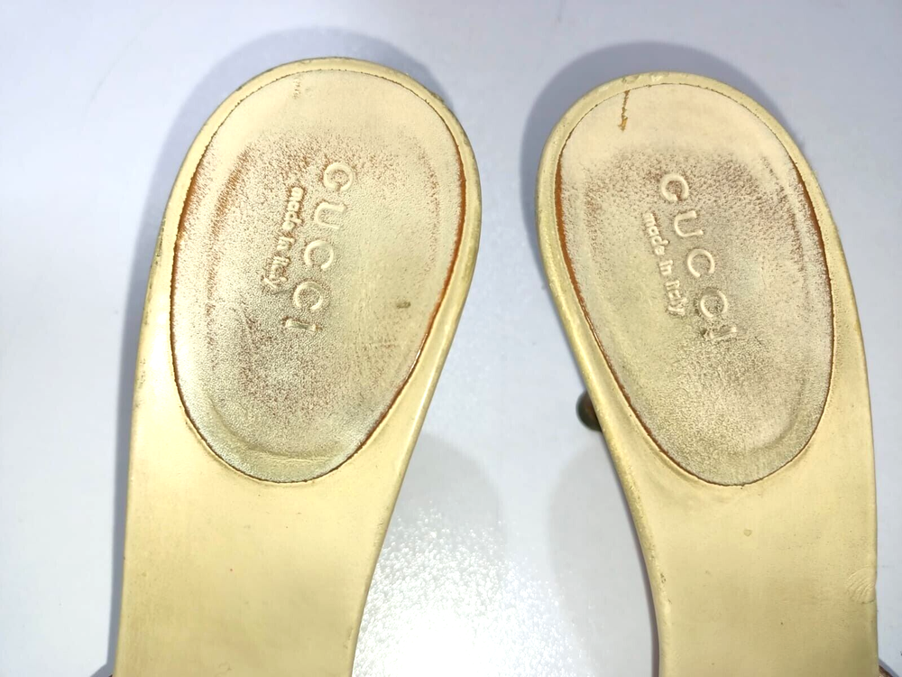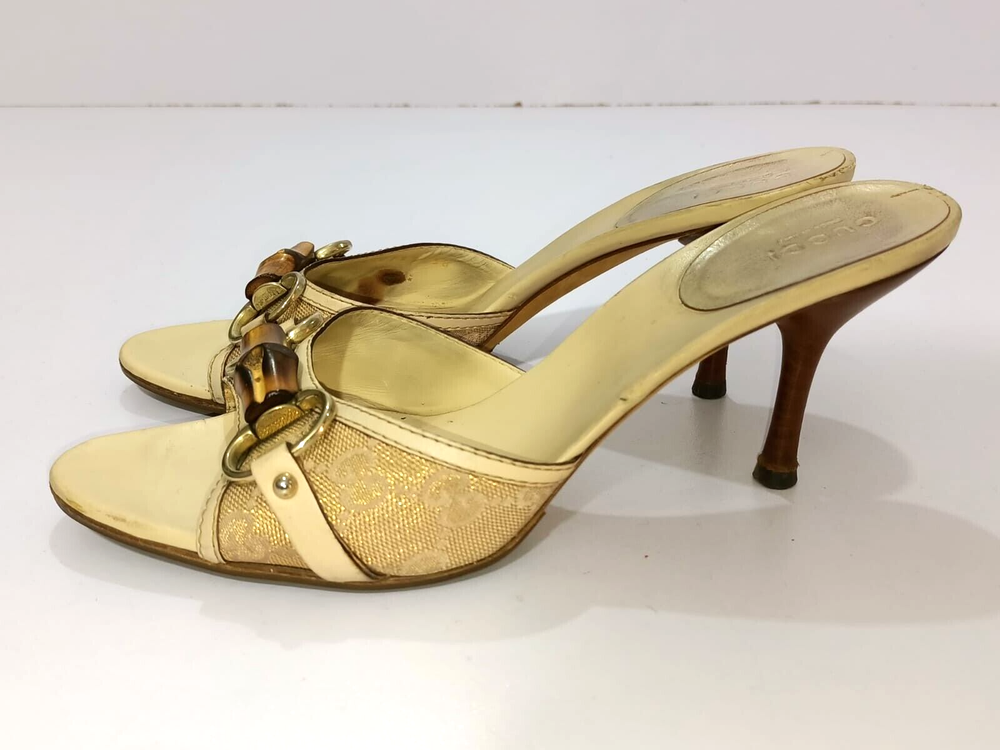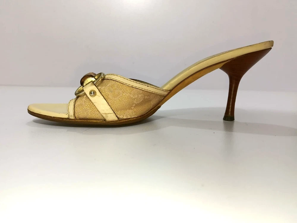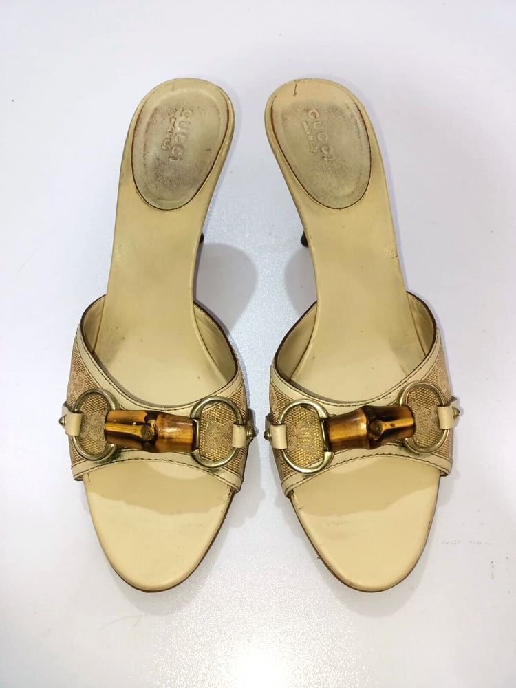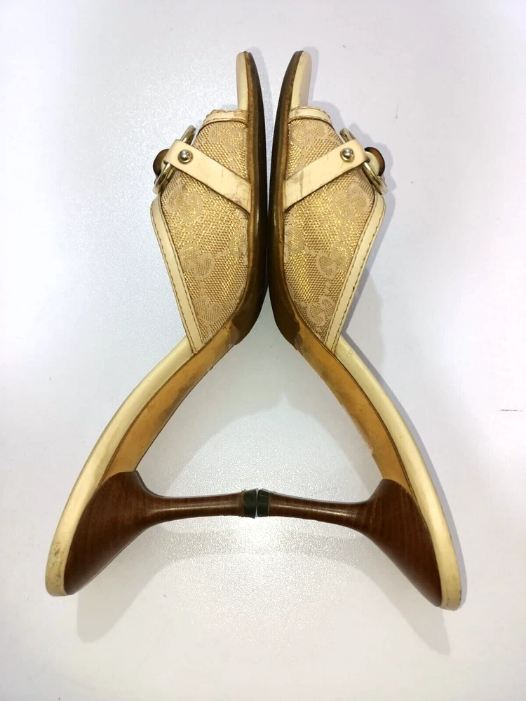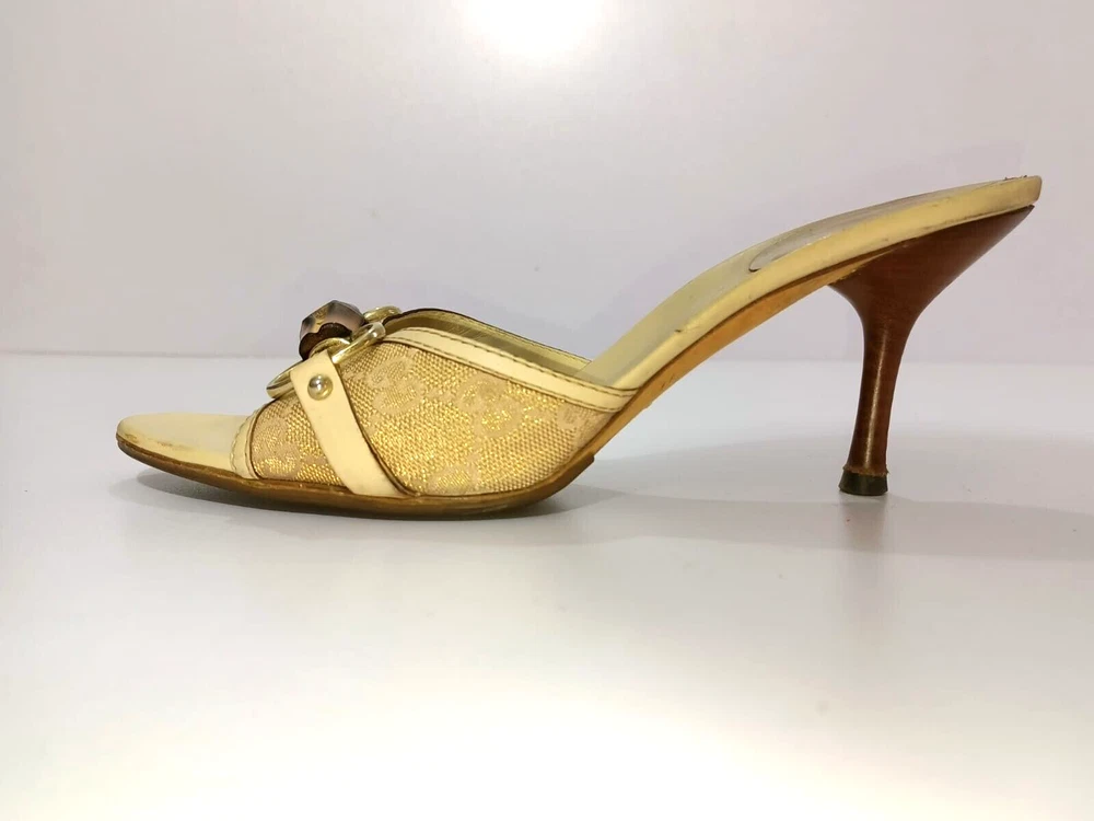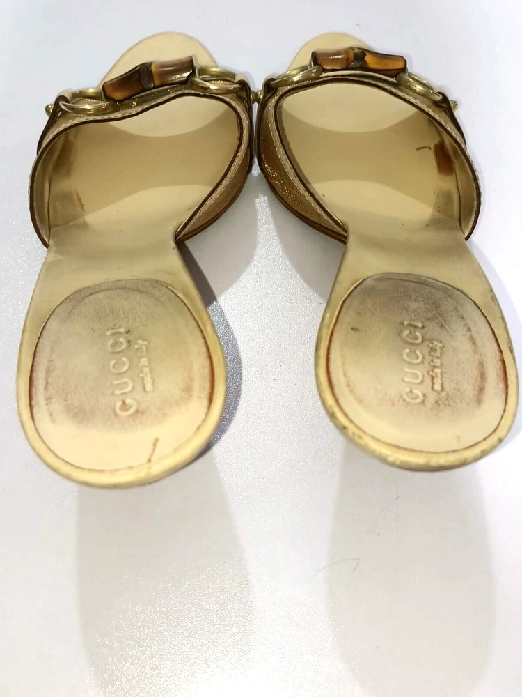Color: WHITE/GOLDEN CANVAS Type: Heel Department: Women Country/Region of Manufacture: Italy Insole Material: Leather EU Shoe Size: 38 Outsole Material: Leather Occasion: Business, Casual, Christening, Formal, Travel UK Shoe Size: 5 Style: Mule AU Shoe Size: 6 Upper Material: CANVAS US Shoe Size: 7.5 Seller Notes: “GUCCI BAMBOO HORSEBIT GG CANVAS SLIDES MULES SIZE, EU38, US7.5, IS IN USED CONDITION,” Brand: Gucci Toe Shape: Open Toe