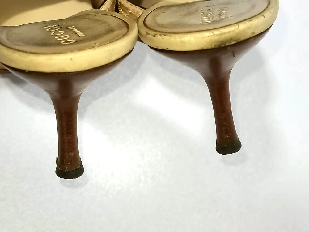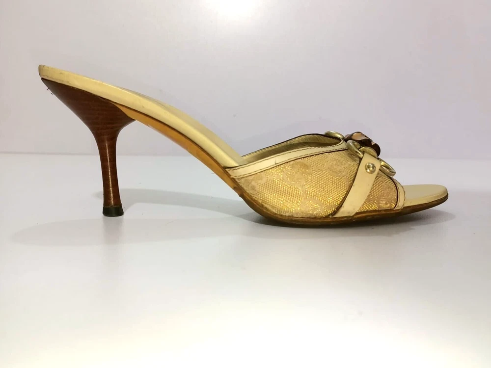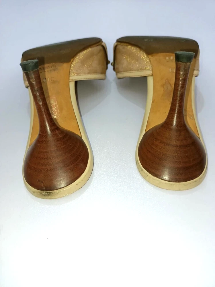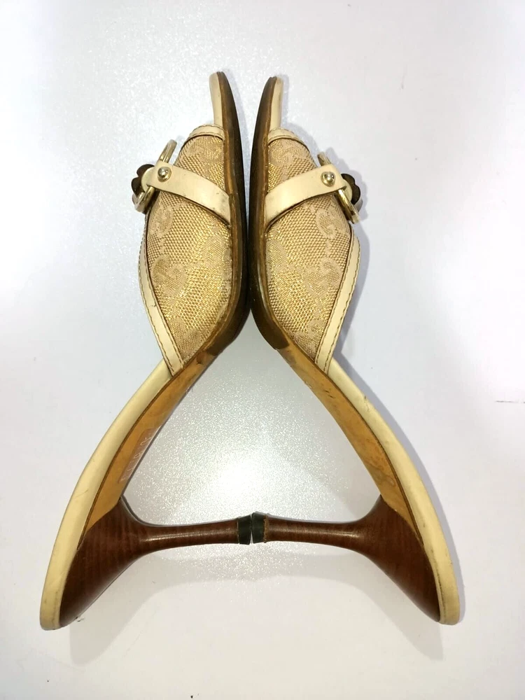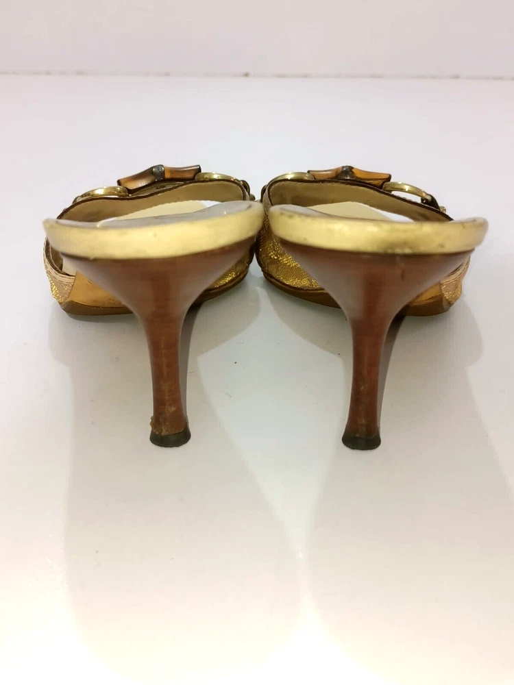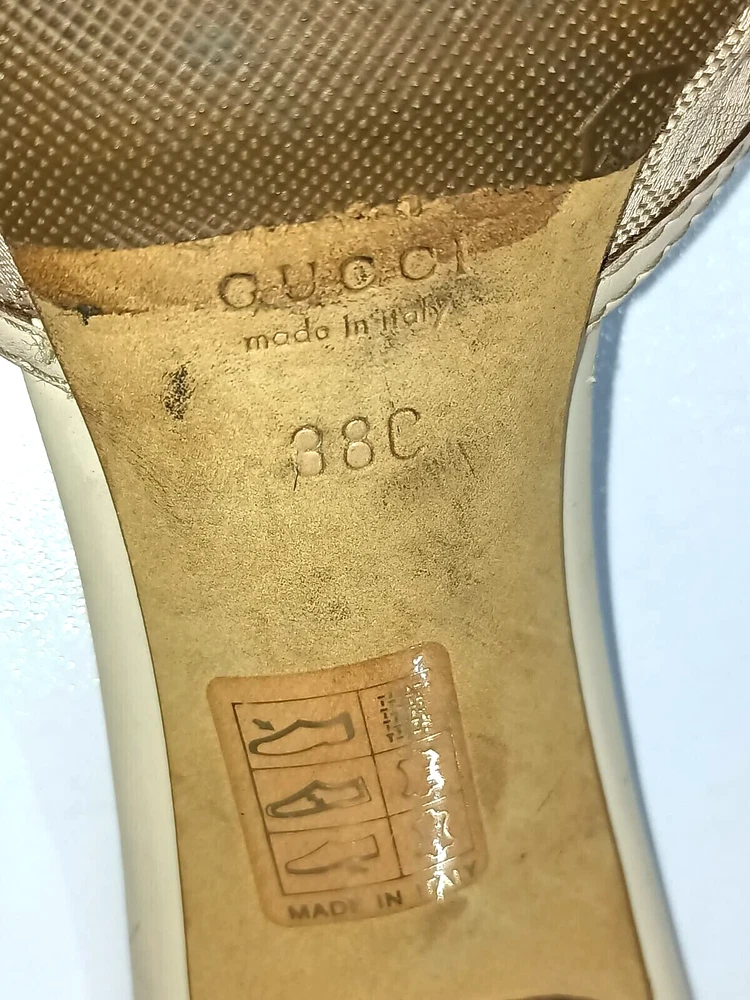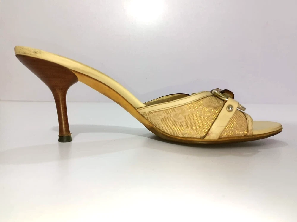 Color: WHITE/GOLDEN CANVAS Type: Heel Department: Women Country/Region of Manufacture: Italy Insole Material: Leather EU Shoe Size: 38 Outsole Material: Leather Occasion: Business, Casual, Christening, Formal, Travel UK Shoe Size: 5 Style: Mule AU Shoe Size: 6 Upper Material: CANVAS US Shoe Size: 7.5 Seller Notes: “GUCCI BAMBOO HORSEBIT GG CANVAS SLIDES MULES SIZE, EU38, US7.5, IS IN USED CONDITION,” Brand: Gucci Toe Shape: Open Toe