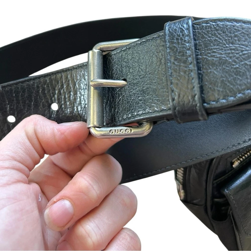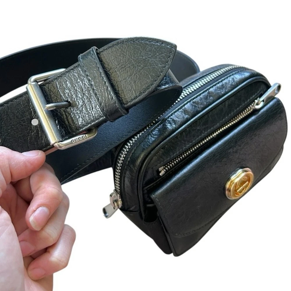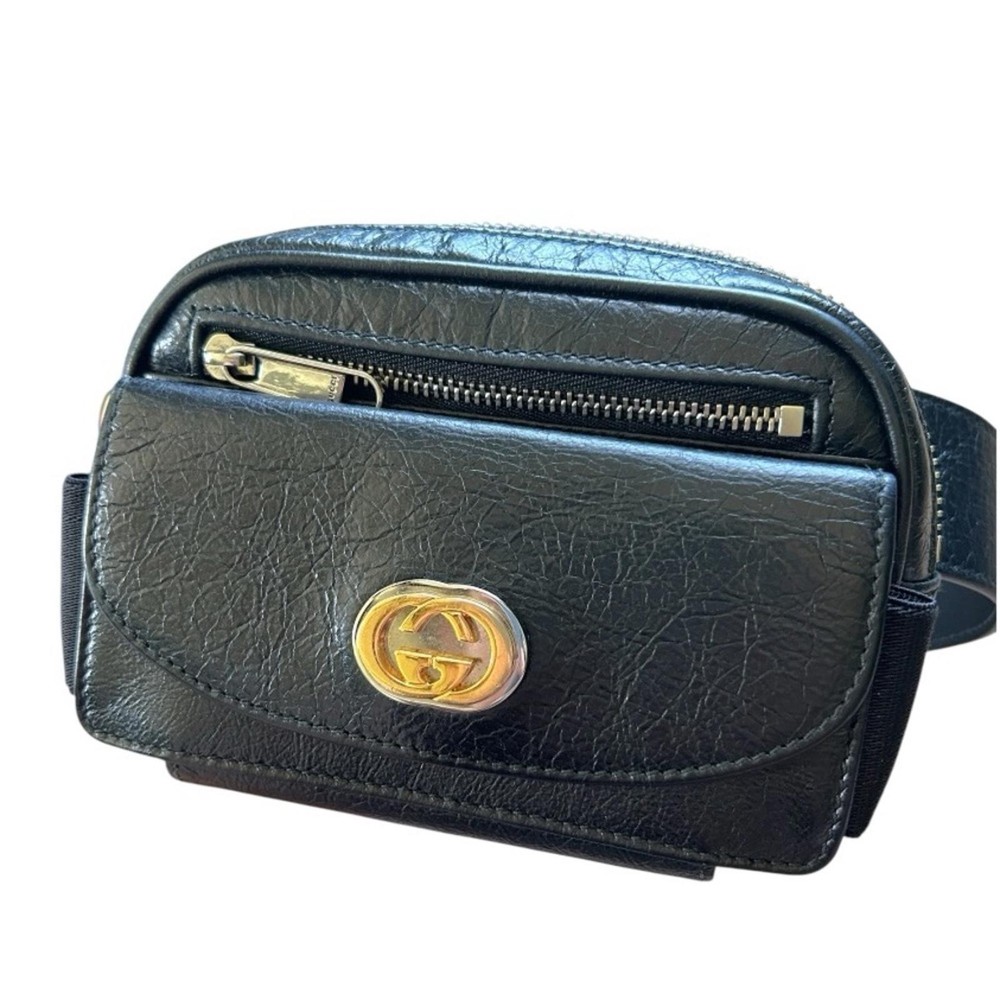 GUCCI Cracked Calfskin Morpheus Belt Bag in Black This belt bag is crafted of black textured leather with a vintage 1970's aesthetic. This bag comes with an adjustable leather belt and a gold and silver GG logo on thefront. The zipper opens to a fabric interior. This compact belt bag is perfect for any time of the day with distinctive style Gucci Belt Bag Black Leather Printed Silver-Tone Hardware Adjustable Waist Strap Dual Exterior Pockets Canvas Lining Zip Closure at Top Includes Box and Dust Bag Strap Length: 28" Height: 4" Width: 5.5" Depth: 2" Belt: Approx 39.5” DesignerID: 597676 562600