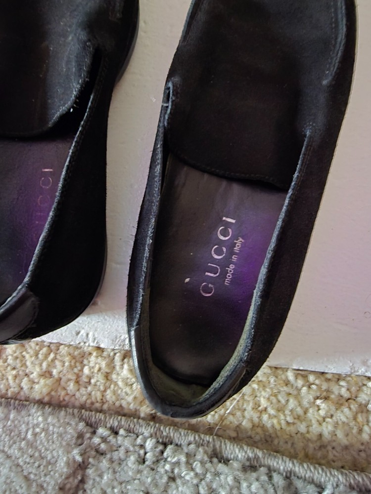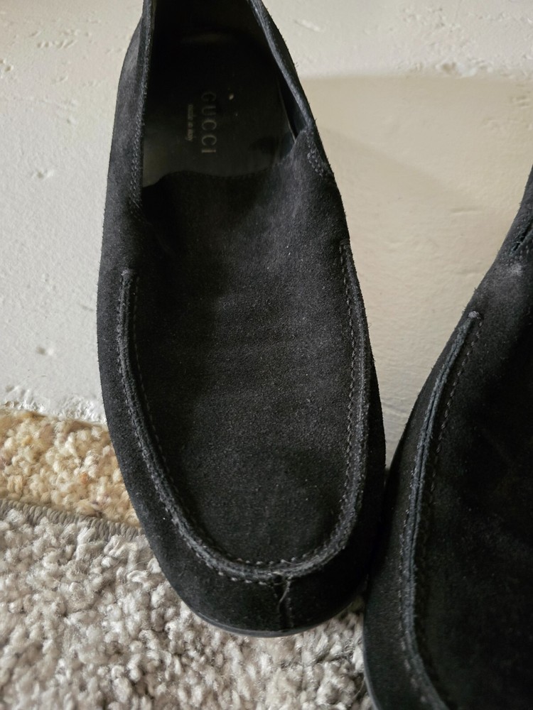 Step into sophistication with these black suede loafers from the iconic brand Gucci. Designed with the modern woman in mind, they perfectly blend style and comfort. The classic loafer silhouette is crafted to complement a variety of outfits, making them a versatile addition to your wardrobe.These flats are a size US 8.5 B, ensuring a comfortable and snug fit. The high-quality suede upper material offers durability while exuding a luxurious feel. Whether you're heading to the office or enjoying a casual day out, these Gucci loafers are sure to elevate your ensemble.