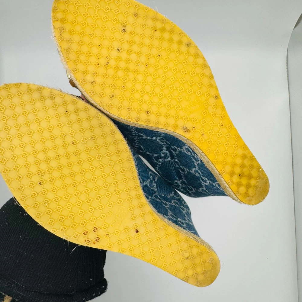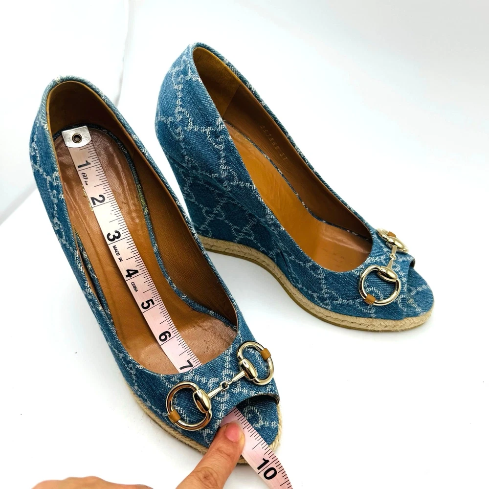 GUCCI DENIM MONOGRAM HORSEBIT WEDGES Size 37 - I’d say these are true to size Excellent used condition, box included ! Some residue on bottom soles and some signs or wear on denim. No major stains These Gucci denim monogram wedges with the classic horsebit detail combine a casual and chic aesthetic. Their espadrille-inspired rope trim and wedge heel make them a versatile choice for summer outings. Measurements are approximate . It may be helpful to compare these product measurements to a similar piece you already own. tags: fall, autumn, winter, cool weather, boho, bohemian, mini, tiered, ruffle, fit & flare, long sleeve, date night, night out, event, evening, special occasion, cocktail, dinner, career, business, work, workwear, professional, fashion, fashionable, trendy, wedding, bride, trendsetter, ootd