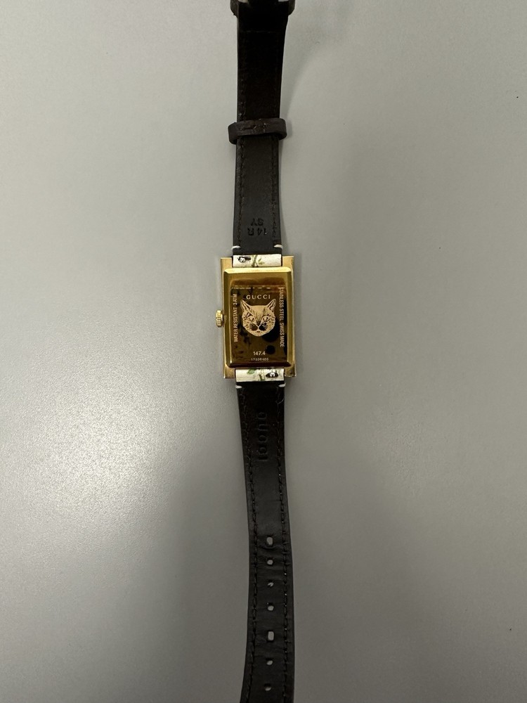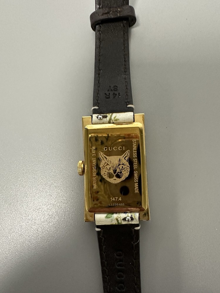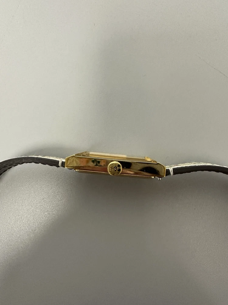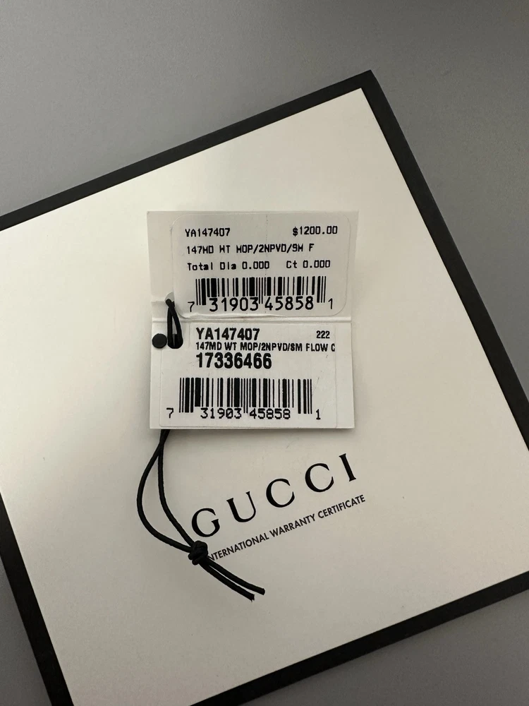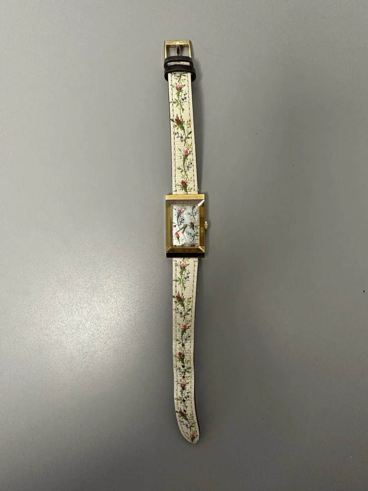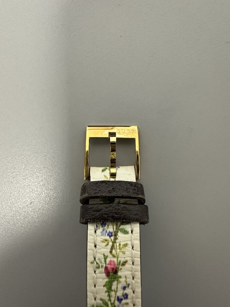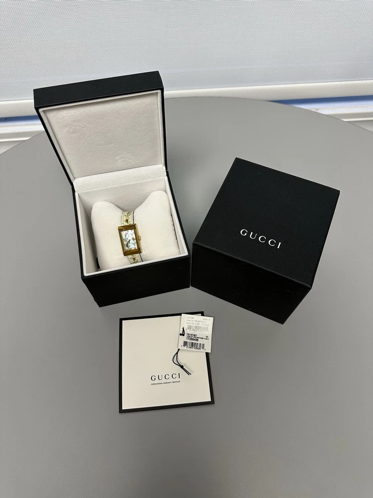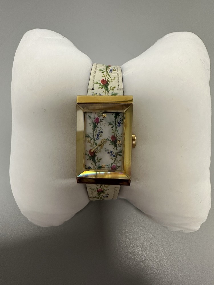 Elevate your style with this luxurious Gucci G-Frame watch, featuring a beautiful mother-of-pearl floral dial and a stainless steel case with a gold tone. The watch is Swiss-made, with a reliable quartz movement and a 12-hour dial. It has a fixed bezel and a rectangle case shape, with a size of 21 x 34 mm. The watch is water-resistant up to 30 meters (3 ATM) and comes with a leather band in a floral pattern. This classic and dressy watch is perfect for women who want to add a touch of elegance to their outfits. It is a 2010-2019 model, and it comes with its original box and manual/booklet. The watch is guaranteed to be authentic and is a great addition to any watch collection.