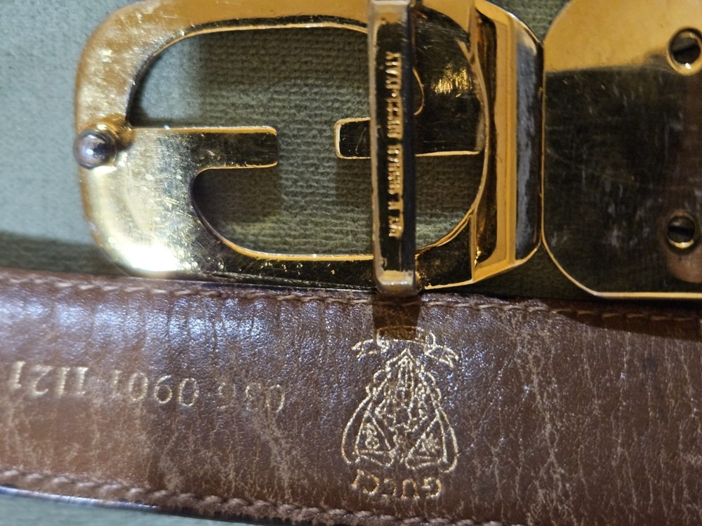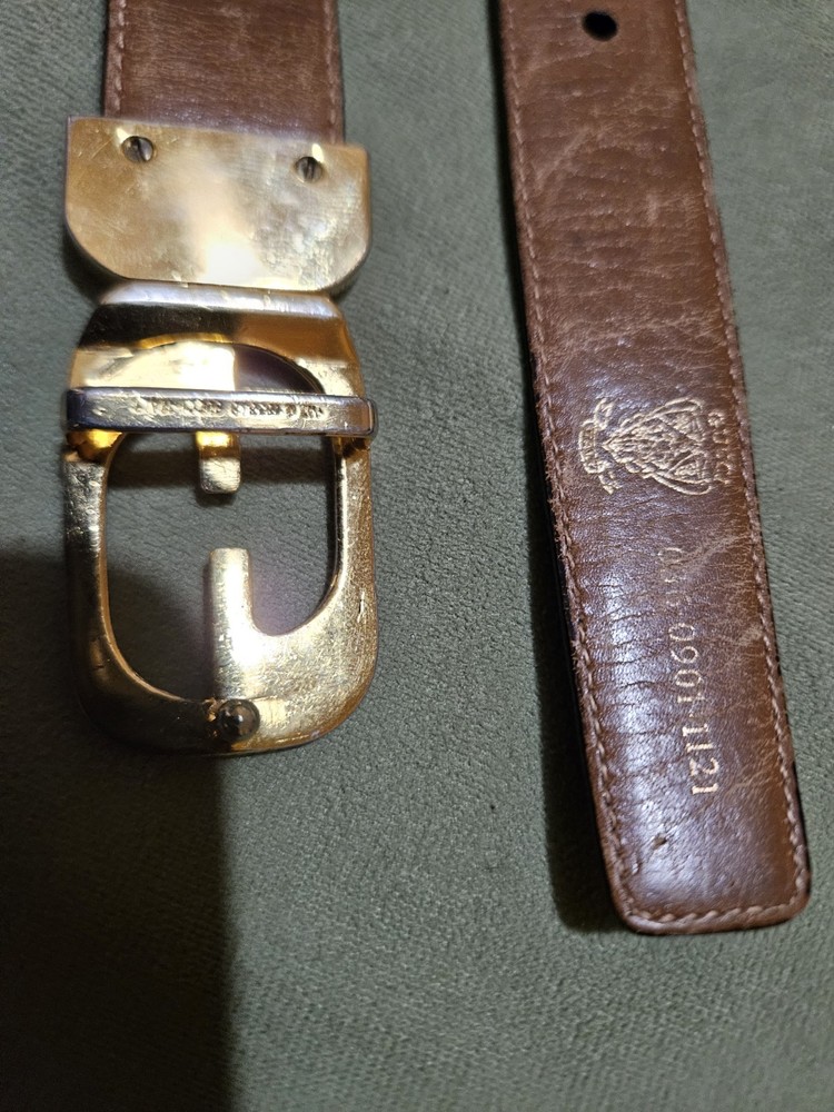 The product is an authentic Gucci GG buckle belt in black and brown, measuring 38 inches in length and made in Italy. It features a solid pattern with a leather material and a stylish buckle accent. Designed as a dress belt for men, this high-quality accessory is perfect for adding a touch of luxury to any outfit. The signature Gucci brand and Italian craftsmanship make this belt a sophisticated choice for those looking to elevate their style.