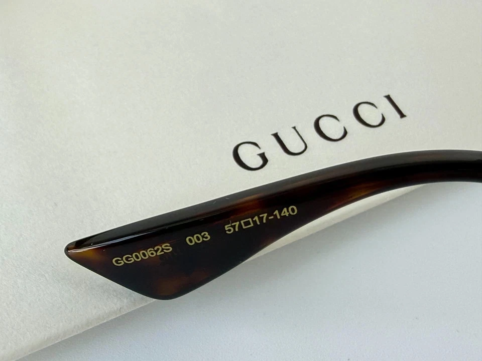 MATERIALS AND CARE Gucci products are made with carefully selected materials. Please handle with care for longer product life. Store in the provided case Clean with a soft, dry cloth If needed, use a damp cloth and mild detergent. Do not use solvents (e.g. alcohol, acetone) or aggressive detergents which may alter the features of the glasses PRODUCT DETAILS Gold metal with green-red frame Gold metal temples with black tips shaded lens 100% UVA/UVB protection GG0062S Frame height 2” Frame width 5.5”