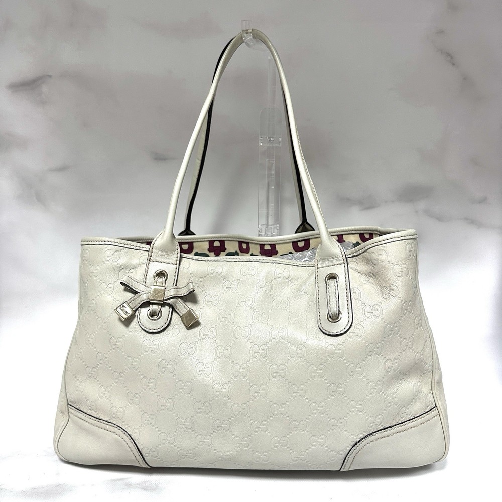 Closure: Open Personalize: No Model: Gucci Princy tote Hardware Color: Gold Country of Origin: Italy California Prop 65 Warning: N/A Accents: Sima Pattern: Gucci Guccissima Shape: Rectangle Product Line: Gucci Princy Hardware Material: Gold-Plated Brand: Gucci Handle/Strap Color: Ivory Features: Inner Pockets Exterior Color: Ivory Lining Color: Multicolor Materials sourced from: Italy Bag Width: 14.57in/37cm Bag Height: 8.66in/22cm Character: Gucci Princy Customized: No Bag Depth: 3.94in/10cm Department: Women Vintage: No Handle Drop: approx. 8.27in (21cm) Handle Style: Double Handles Exterior Material: Leather Handle/Strap Material: Leather Handmade: No Lining Material: Canvas Theme: 90s Size: Medium Occasion: Business, Casual, Workwear Style: Tote