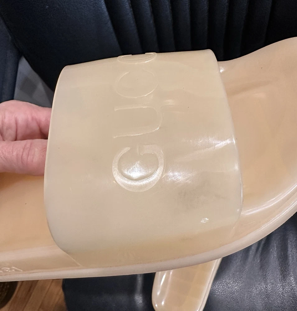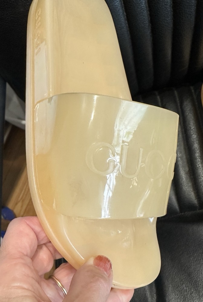 Elevate your summer footwear game with these stylish Gucci Transparent Rubber Logo Slides Sandals. Featuring a slip-on closure, standard shoe width, and a solid pattern, these sandals are perfect for any casual occasion. The upper and insole are made of high-quality rubber, ensuring comfort and durability. These sandals are designed for men and are available in US shoe size 8, and EU shoe size 41. As these are pre-owned, they are not perfect, but still great shape. Slight marks on tops -see last two pics, and a few scratches. But, a fab deal, for these status, authentic Gucci sandals! Items will always be mailed within one business day of purchase, and by using the most reliable and cost efficient method, usually Priority. If there is a huge difference in price, you will receive a shipping credit. I want to foster great lines of communication with my buyers. Please check out all photos, and feel free to ask questions before purchase. Thanks for looking, and check out my other fab handbags for sale.