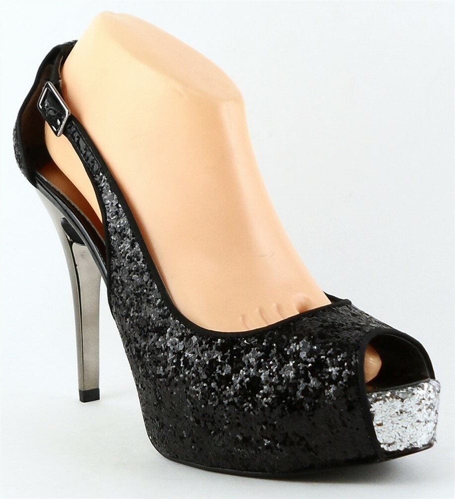 New/ clearance in original box Glitter upper; Man-made sole Mirrored heel measures 4 1/2"; Platform 1" * Lightly padded footbed Features an open toe, chic cutouts and an adjustable ankle strap GUESS pumps up the volume on the classic pump and the result is stunning