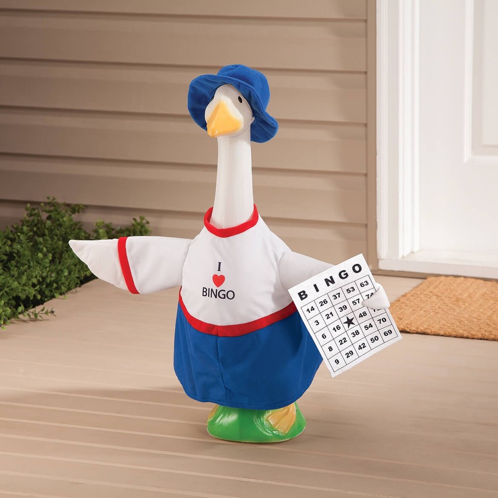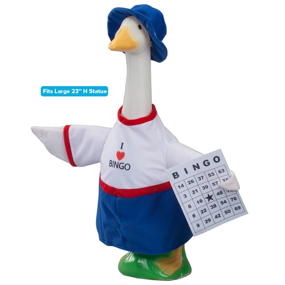 An official Gaggleville Goose outfit!Transform your lucky goose into a card-carrying, dauber-dabbing' winner, dressed in this fun Bingo outfit! Featuring an "I heart Bingo" shirt, blue skirt and matching hat with elastic strap, your goose will be the best-dressed player in the Bingo hall (or your apartment hall, front porch, game room or patio!). Our adorable goose outfit even includes two wings ... and one is carrying a classic Bingo card for added fun. It's exclusively designed to fit our large goose (sold separately); for indoor/protected outdoor use. Polyester/cotton; spot clean. Imported. By Gaggleville. Powered by Frooition Buy one, get one at 15% off! On All Products Storewide SALE Holidays Home Kitchen Office Health Beauty Apparel Jewelry & Accessories Outdoor Entertainment Candy Shoppe Intimacy Automotive Accessories BINGO Large Goose Outfit by Gaggleville Gaggleville Bingo Goose Outfit, Fits Large 23" H Statue Item Description An official GagglevilleTM Goose outfit! Transform your lucky goose into a card-carrying, dauber-dabbing' winner, dressed in this fun Bingo outfit! Featuring an "I heart Bingo" shirt, blue skirt and matching hat with elastic strap, your goose will be the best-dressed player in the Bingo hall (or your apartment hall, front porch, game room or patio!). Our adorable goose outfit even includes two wings ... and one is carrying a classic Bingo card for added fun. It's exclusively designed to fit our large goose (sold separately); for indoor/protected outdoor use. Polyester/cotton; spot clean. Imported. By GagglevilleTM. About Us About Us Payment Shipping Customer Service About Us Welcome to Fox Valley Traders on ebay, where we specialize in providing an evolving selection of one-of-a-kind products at affordable prices. With roots dating back to 1935, our knowledgeable team is dedicated to bringing you high-quality, functional, and unique household products and gifts that won't break the bank. Our mission is to continuously innovate and improve items based on customer needs and industry trends. We are the proud owners and developers of multiple brands, including Miles Kimball, Walter Drake, Easy Comforts, Holiday Peak, OakRidge, LivingSure, Exposures, NativeRemedies and PetAlive. Learn more about these brands and their product offerings below. We invite you to spend some time in our ebay storefront. Shop around, explore our brands, and read what other satisfied customers are saying. Let us know how we can help - we would be honored to earn your business! Miles Kimball specializes in a wide variety of festive holiday decorations, handy kitchen gadgets, storage and organization solutions, gardening supplies, home décor, table covers, pets supplies, and gifts for everyone! We strive to delight our customers with hard-to-find gadgets and personalized gifts that are unique, unusual, and unexpected. Walter Drake has an extensive line of products that are functional problem-solvers for your home. Find great values in kitchen gadgets, cookware and bakeware, lawn and garden, bedding, calendars, and office supplies. Easy Comforts strives to make difficult times more comfortable, while helping you (or someone you care about) find solutions to life's physical challenges. Discover value-priced health and personal care items including home security, bathroom safety, daily living aids, diabetic socks, dressing aids, incontinence solutions, and pain remedies. Holiday Peak is your one-stop holiday shop! Find seasonal décor to bring a warm and inviting holiday atmosphere to your home all year. We offer pre-lit, fully decorated Christmas trees, unique Christmas tree ornaments and heartwarming Christmas cards for the winter season. Keep your festive spirit alive all year with our seasonal indoor and outdoor decor for Valentine's Day, St. Patrick's Day, Easter, patriotic and fall seasons . OakRidge offers top quality home items at an affordable price. Bring the warmth and comfort of home to any space with our exclusive bed linens, bath essentials, small furniture, floral décor, and other home furnishings. LivingSure is on a mission to develop products that will help keep you safe, secure, and independent both inside your home and out. Find smart solutions for personal safety, home security, emergency radios, auto blankets, flashlights, ladders, step-stools, and more. Exposures knows the value of special moments and experiences and wants to help you preserve them forever. Celebrate life's memories with our exclusive photo albums, frames, gifts, and home décor. NativeRemedies and PetAlive offer homeopathic health and wellness products for your whole family, including your pets! Enjoy our quality herbal and natural remedies for treating common ailments. Payment Payment We accept PayPal payments only. Sales Tax: For shipments to Wisconsin addresses, we are required by State law to collect Sales Tax. Shipping Shipping In order to keep things simple for you, Fox Valley Traders offers $1.99 shipping on Ebay for all Continental US Street and PO Box addresses. We use standard shipping for all orders in the continental US. Please allow 7-9 days for delivery Customer Service Customer Service If you have any questions about the item, please click the "Ask a question" link below. All returns must be made within 45 days from the date of shipment. We carefully inspect orders prior to shipment; upon receipt, please inspect your purchase and notify us of any damage. We will arrange for a prompt replacement. Shipping charges will not be reimbursed. Please contact us through our Ebay account for information on how to return an item. *All returns will be accepted unless otherwise noted in item description.* More Items! View more great items Gaggleville Reindeer Baby Goose Outfit, Fits Baby 17" H Statue, by Fox Valley Tr $28.43 Gaggleville Conversation Heart Goose Outfit, Fits Large 23" H Statue, by Fox Val $33.56 Gaggleville Bumble Bee Goose Outfit, Fits Large 23" H Statue, by Fox Valley Trad $29.9