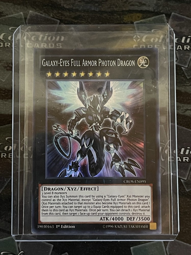 *Topaloader/sleeve included and daily shipping in secure packaging.* This Galaxy-Eyes Full Armor Photon Dragon card from the Crossed Souls set is a must-have for any Yu-Gi-Oh! TCG collector. With its impressive attack and defense stats of 4000 and 3500 respectively, it's a powerful addition to any deck. The card features a unique dragon character with a cool armor design, making it a great addition to any collection. This Super Rare card is a 1st Edition and has the card number CROS-EN095. It's an Xyz, Effect card with English language and manufactured by Konami. The card's attribute is Light, and it's perfect for players who want to add a powerful dragon to their game. Get your hands on this Galaxy-Eyes Full Armor Photon Dragon today!