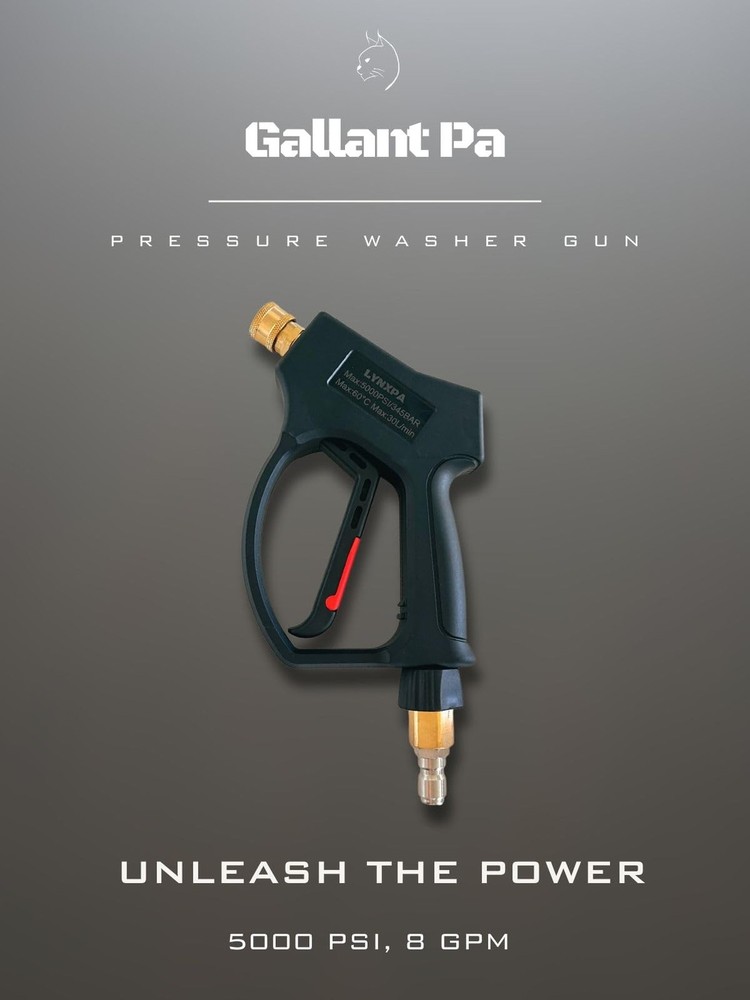 Gallant Pa Short Swivel Pressure Washer Gun, 5000 PSI, 8 GPM, 1/4" Quick Connector Outlet, 3/8" Quick Connector and M22-14mm Inlet, for Gas & Electric Pressure Washers, Foam Cannon Car Wash Product Details Material: Stainless Steel, Brass Brand: LYNXPA Item dimensions L x W x H: 11 x 6.5 x 1.9 inches Exterior Finish: Stainless Steel or Brass Inlet Connection Type: National Pipe Tapered Outlet Connection Type: Quick Connector Maximum Operating Pressure: 5E+3 Pound per Square Inch Number of Ports: 1 Outlet Connection Size: 0.38 Inches Manufacturer: LYNXPA Material: Stainless Steel, Brass Brand: LYNXPA Item dimensions L x W x H: 11 x 6.5 x 1.9 inches Exterior Finish: Stainless Steel or Brass Inlet Connection Type: National Pipe Tapered Outlet Connection Type: Quick Connector Maximum Operating Pressure: 5E+3 Pound per Square Inch Number of Ports: 1 Outlet Connection Size: 0.38 Inches Manufacturer: LYNXPA UPC: 749565650502 Part Number: LYN-5000-Swivel-PWG-S Item Weight: 2.05 pounds Product Dimensions: 11 x 6.5 x 1.9 inches Country of Origin: China Item model number: LYN-5000-Swivel-PWG-S Color: Black Power Source: Electric & Gas Flow Rate: 8 Gallons Per Minute Batteries Included?: No Batteries Required?: No Date First Available: February 28, 2024 Superior Performance: With a maximum working pressure of 5000 PSI at 8 GPM, Gallant Pa delivers exceptional cleaning results for professionals and homeowners. Built to Last: Crafted from premium stainless steel and brass, Gallant Pa ensures durability and crack resistance. Its shockproof reinforced plastic ribbing provides robust protection. A quality-made tool can change the game. 360 Swivel, Effortless Maneuverability: Effortlessly maneuver with a 360-degree swivel design and a 3/8" brass connector inlet, preventing hose kinks and offering precise reach for thorough cleaning. Quick Setup, Ultimate Compatibility: Effortlessly attach Gallant Pa to foam cannons, nozzle tips, etc. with a 1/4" quick connector outlet. Compatible with both gas and electric pressure washers, Gallant PA is your go-to solution for all cleaning tasks. We've got you covered with an adapter to M22-14mm fitting. What's Included: One 5000 PSI pressure washer gun, one M22-14mm adapter. Upgrade your cleaning routine today with Gallant Pa!